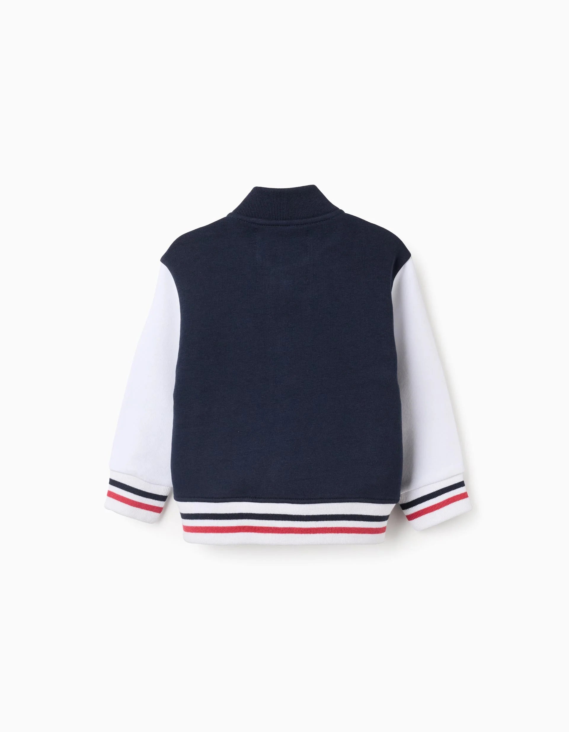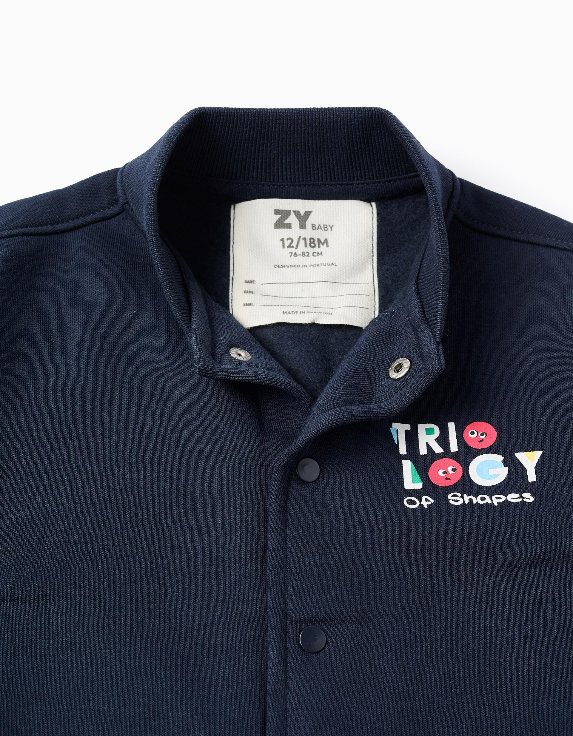 Bomber jacket for baby boys, in a cotton blend, with brushed interior for added thermal comfort. Dark blue body and beige sleeves. Small print on the chest, inspired by the Bauhaus movement. Ribbed and flexible cuffs, with a striped effect, in dark blue and red. Snap buttons. Side pockets. Interior label for child's name. A soft and cosy jacket, for stylish looks!