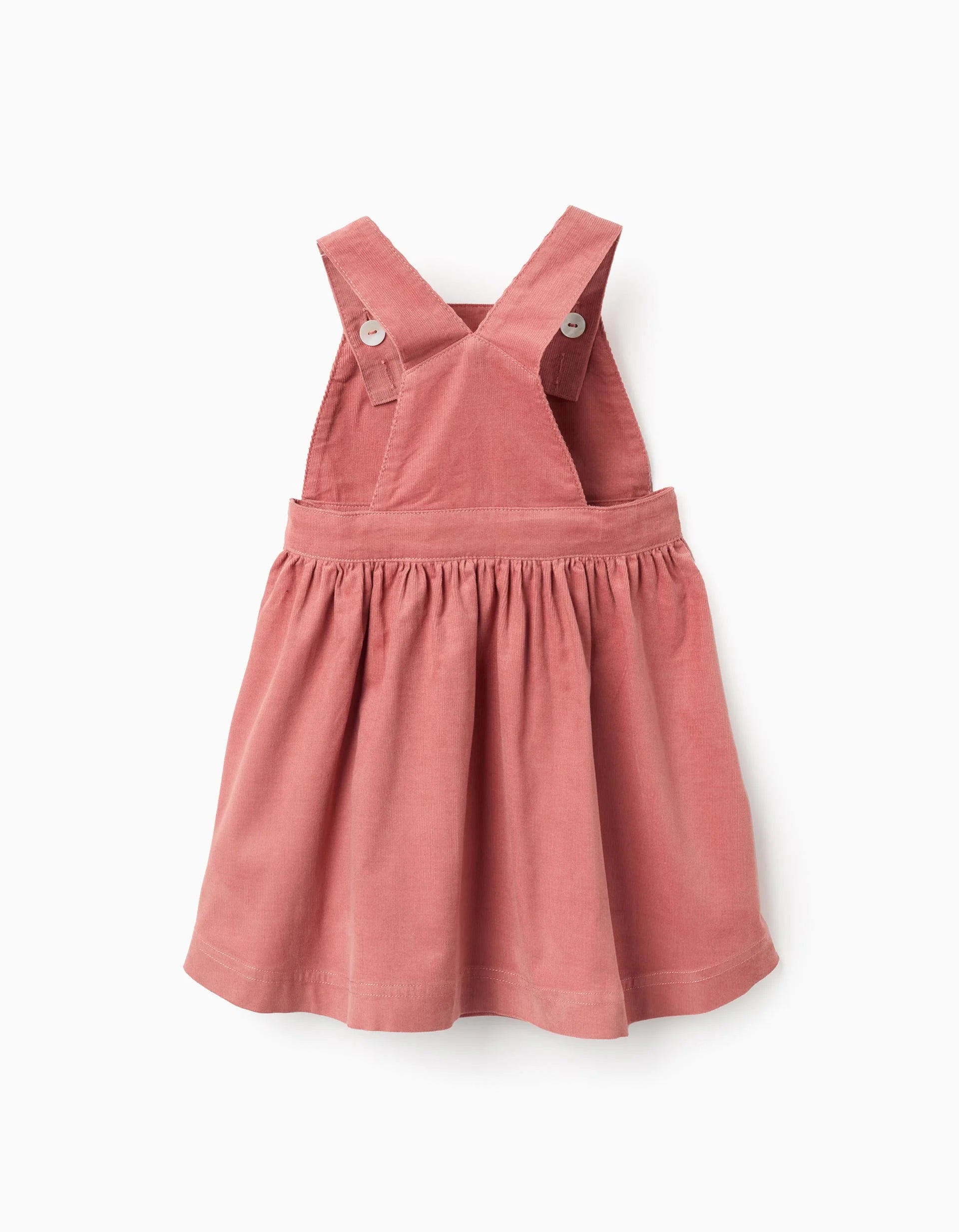Coral corduroy pinafore dress for baby girls, 100% cotton. Ruffles on the chest. Adjustable straps. Snap fasteners at the sides of the waist for a perfect fit. Gathered skirt. For colourful looks!