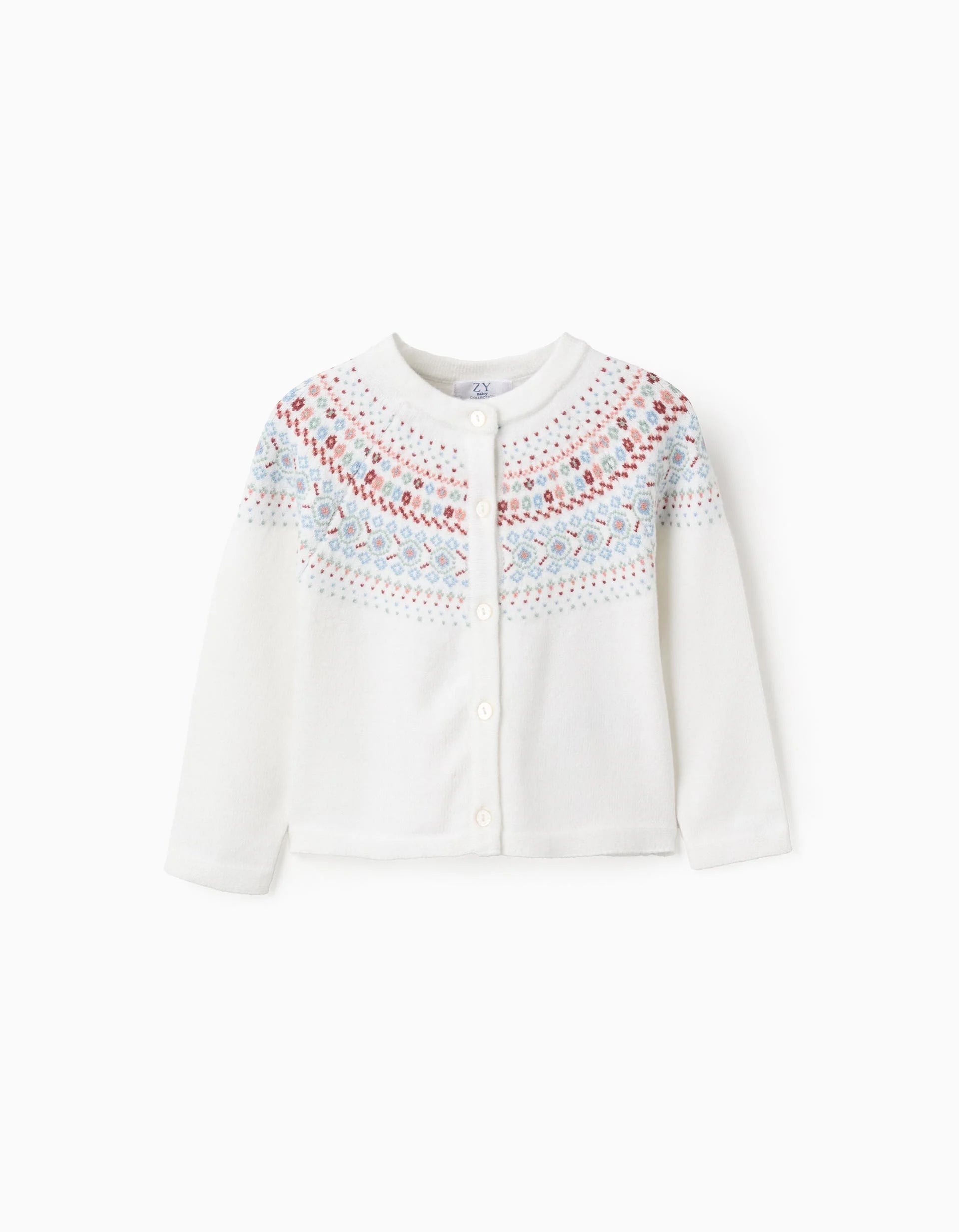 White knitted cardigan for baby girls, with multicolour jacquard on the chest and around the shoulders. A-line fit. A soft and cozy garment with a traditional touch.