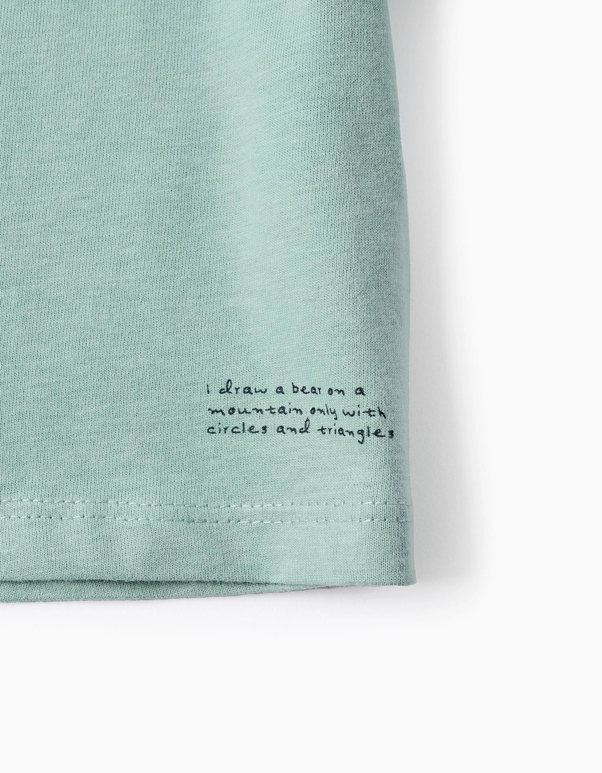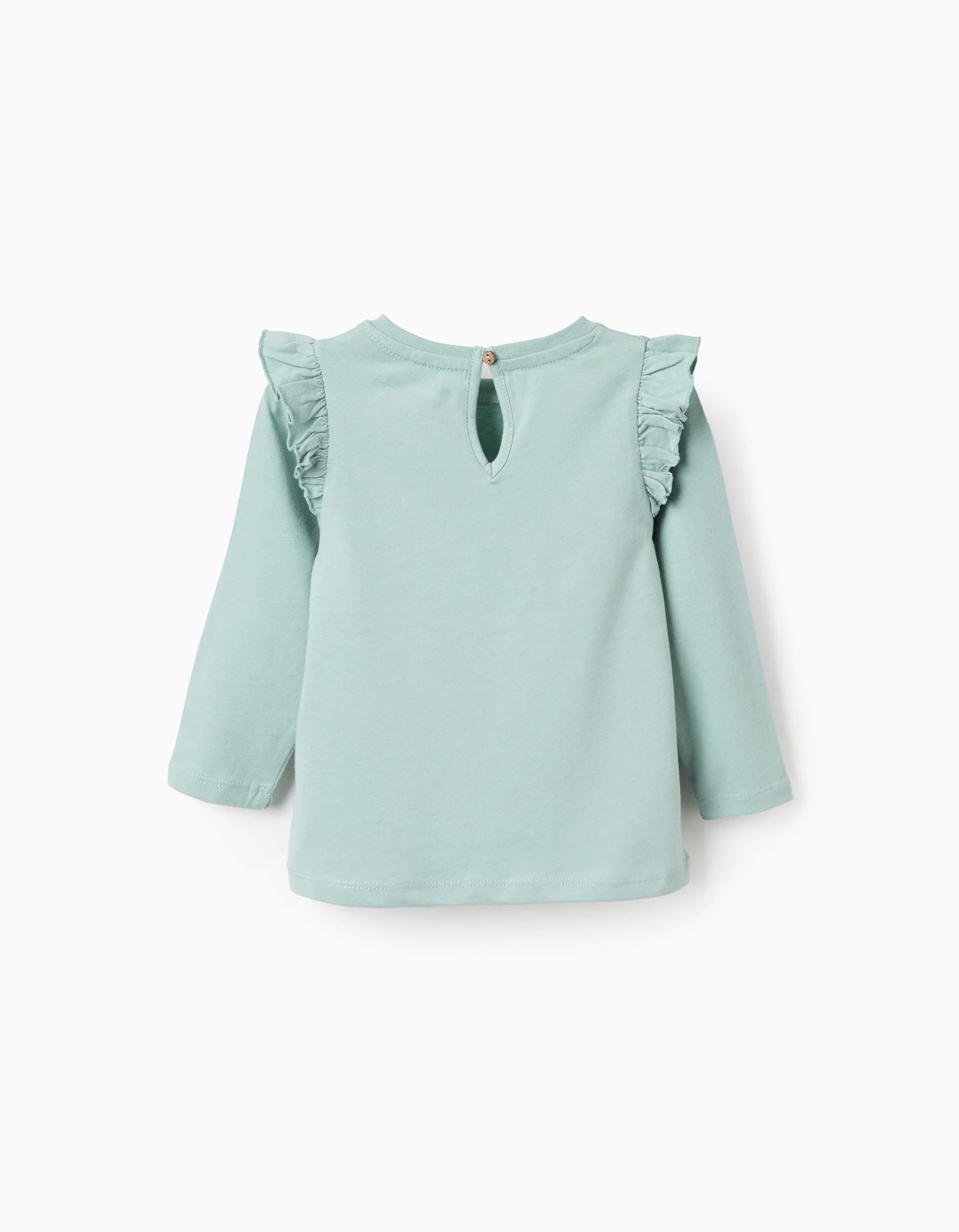 Aqua-green long-sleeved T-shirt for baby girls, 100 per cent cotton. Ruffles around the shoulders and print on the front. Printed inner label so as not to irritate the skin. Button at the back for easy dressing. Evasé waistband. We Care: item certified Oeko-Tex Standard 100, which guarantees the absence of harmful or irritating substances for the skin.