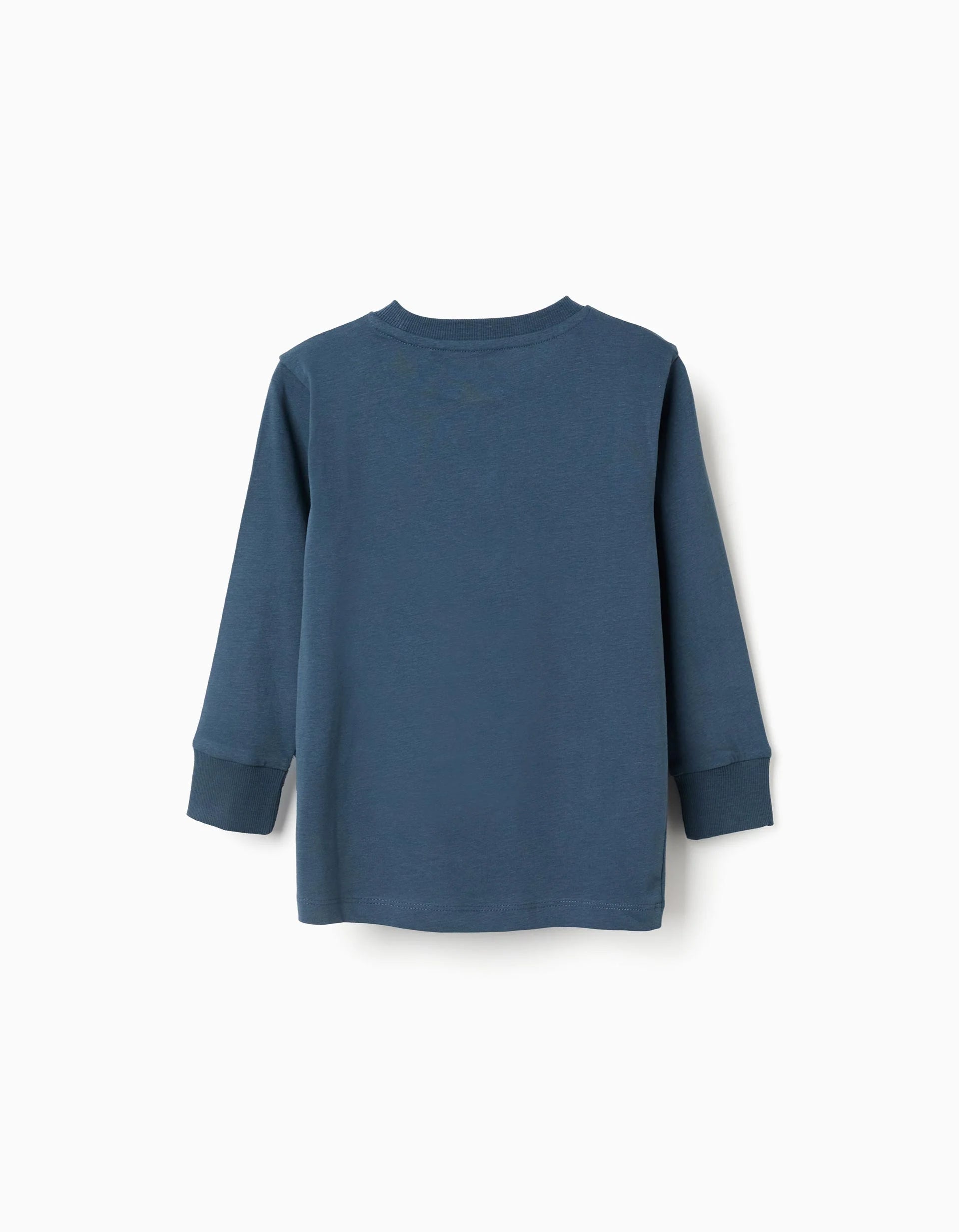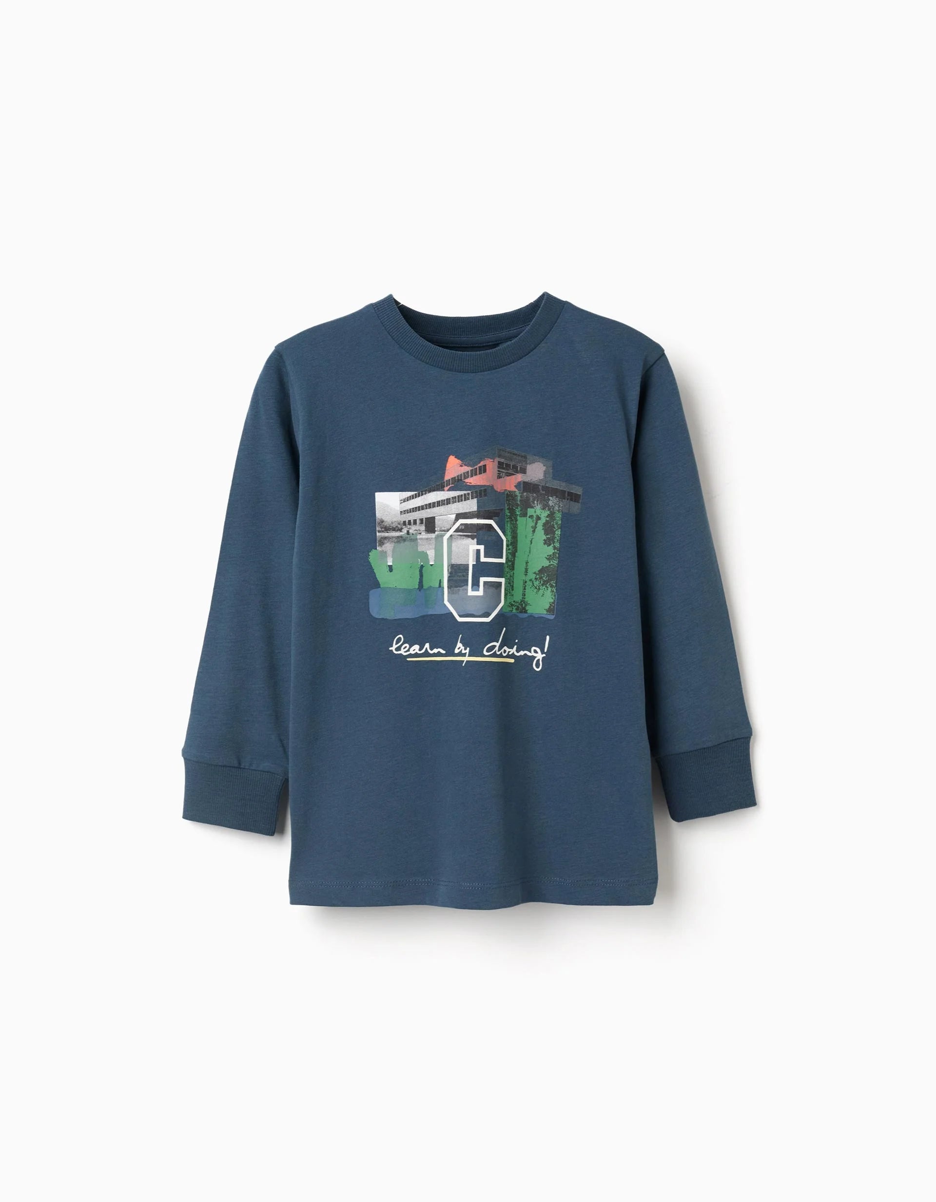 Long sleeve cotton T-shirt with print 'C' for boys, petrol blue
