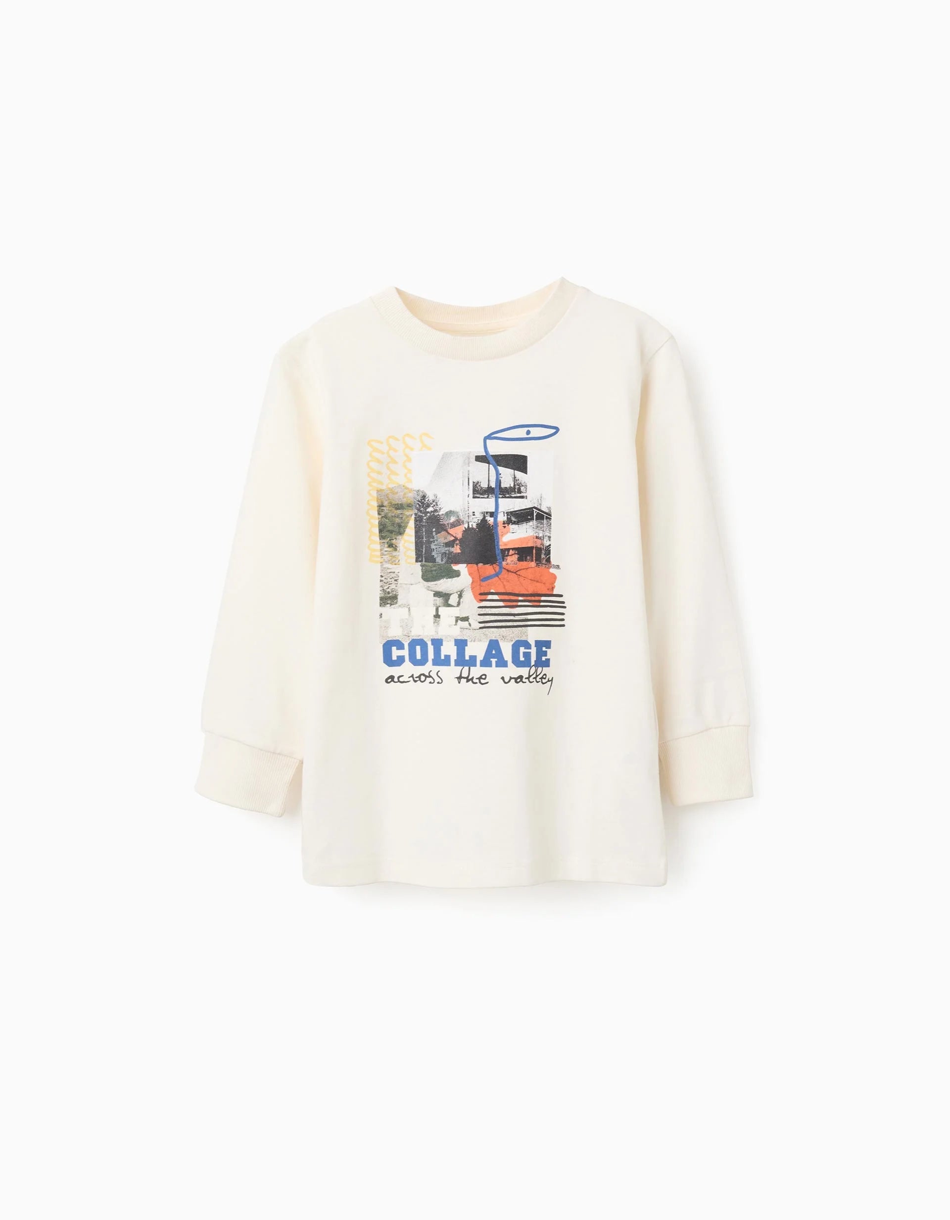 Long sleeve cotton T-shirt with print 'the collage' for boys, white