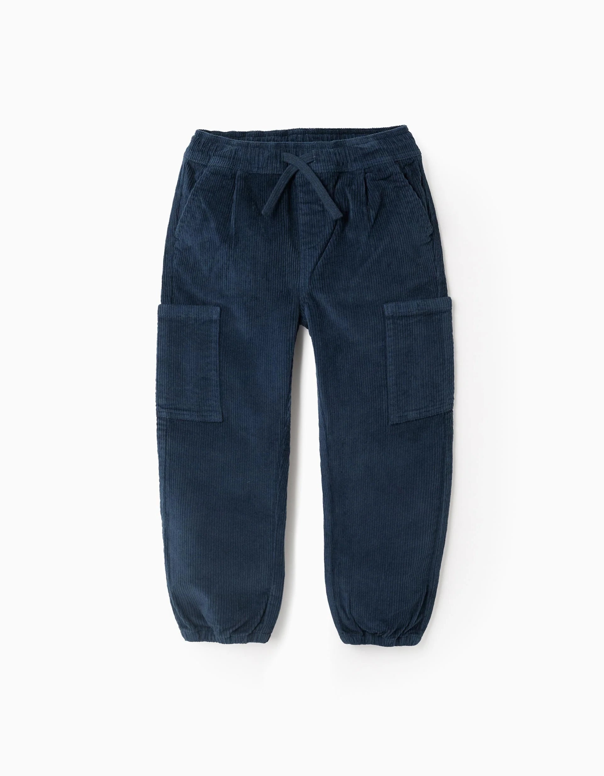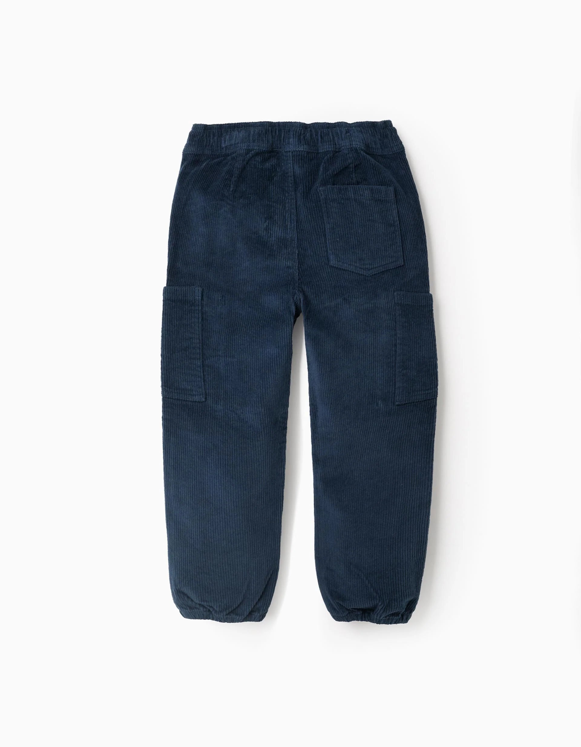 Dark blue corduroy trousers for boys, made from cotton with a touch of stretch for greater comfort and freedom of movement. Straight fit. Cargo pockets. Elasticated waistband with drawstring, adjustable on the inside with elastics and buttons. Elasticated hems. The ideal trousers for the autumn-winter months.