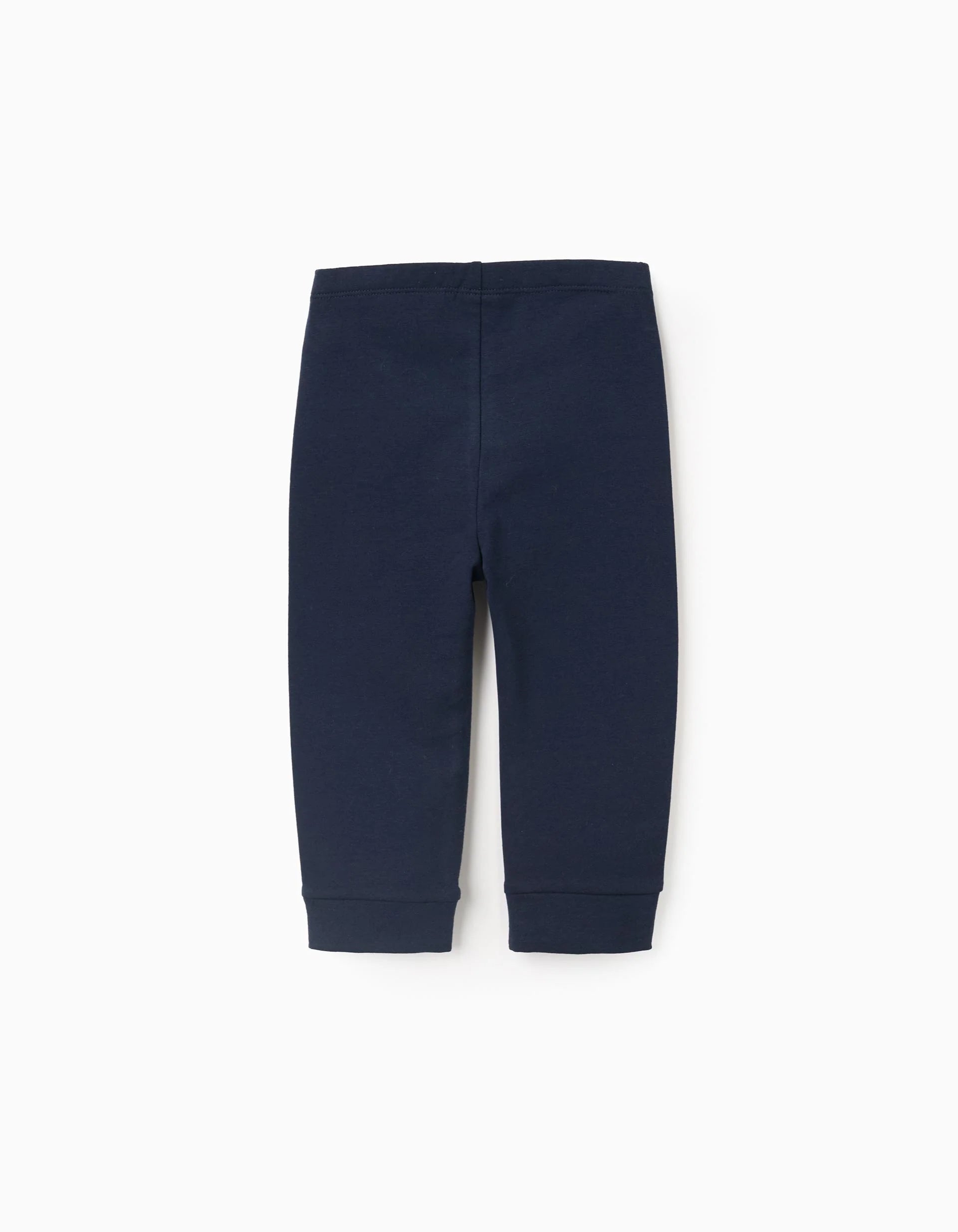 Dark blue jogger trousers for baby girls, in cotton with a touch of stretch for greater comfort and freedom of movement. Brushed interior for greater thermal comfort. Elastic and comfortable waist. Small flower print on the side. Ribbed cuffs for a perfect fit. A practical and comfortable option for everyday wear.
