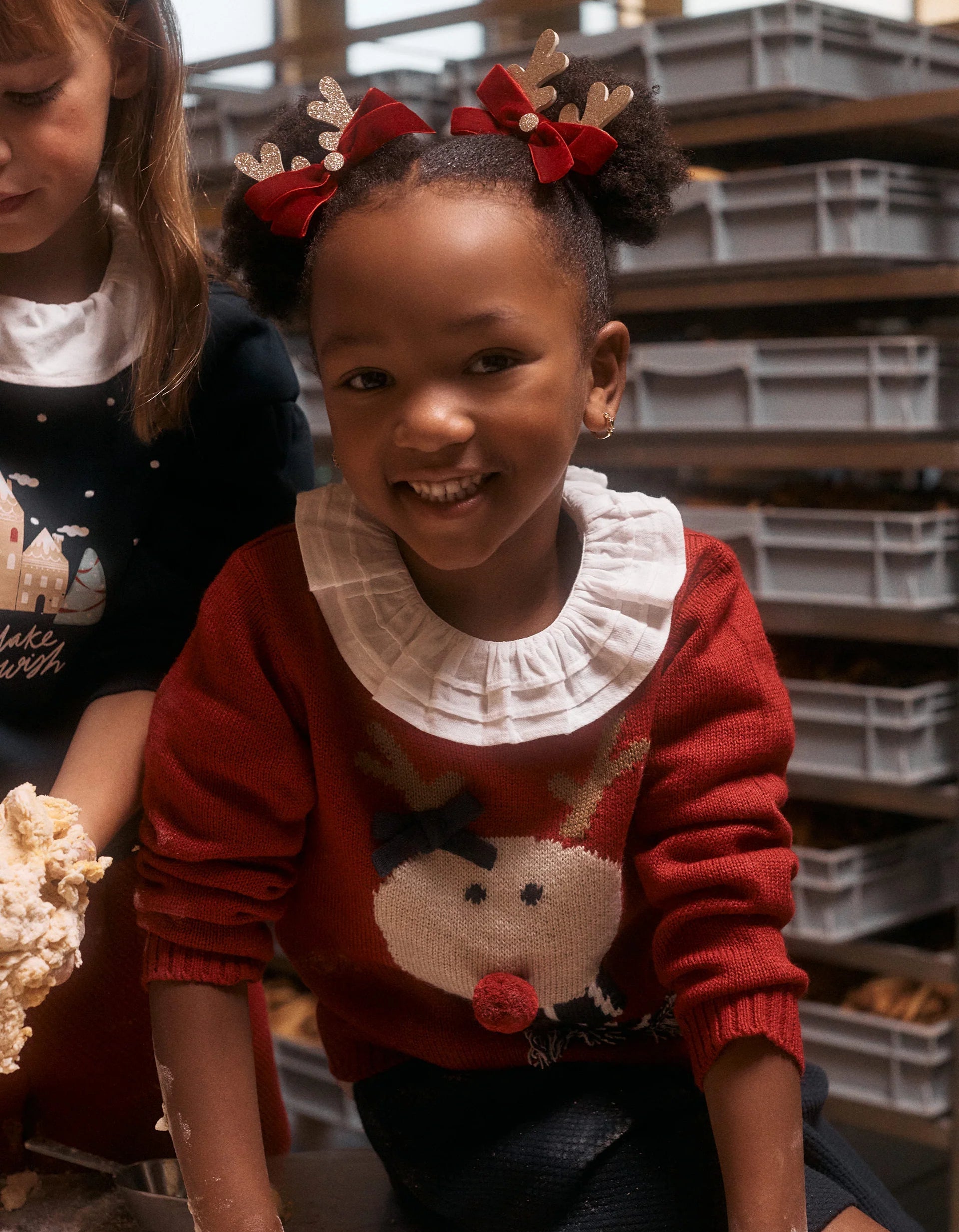 Dark red knitted jumper for girls, with reindeer jacquard. Dark blue bow and red pom-pom detail. Ribbed edges for a perfect fit. Ideal for Christmas looks!