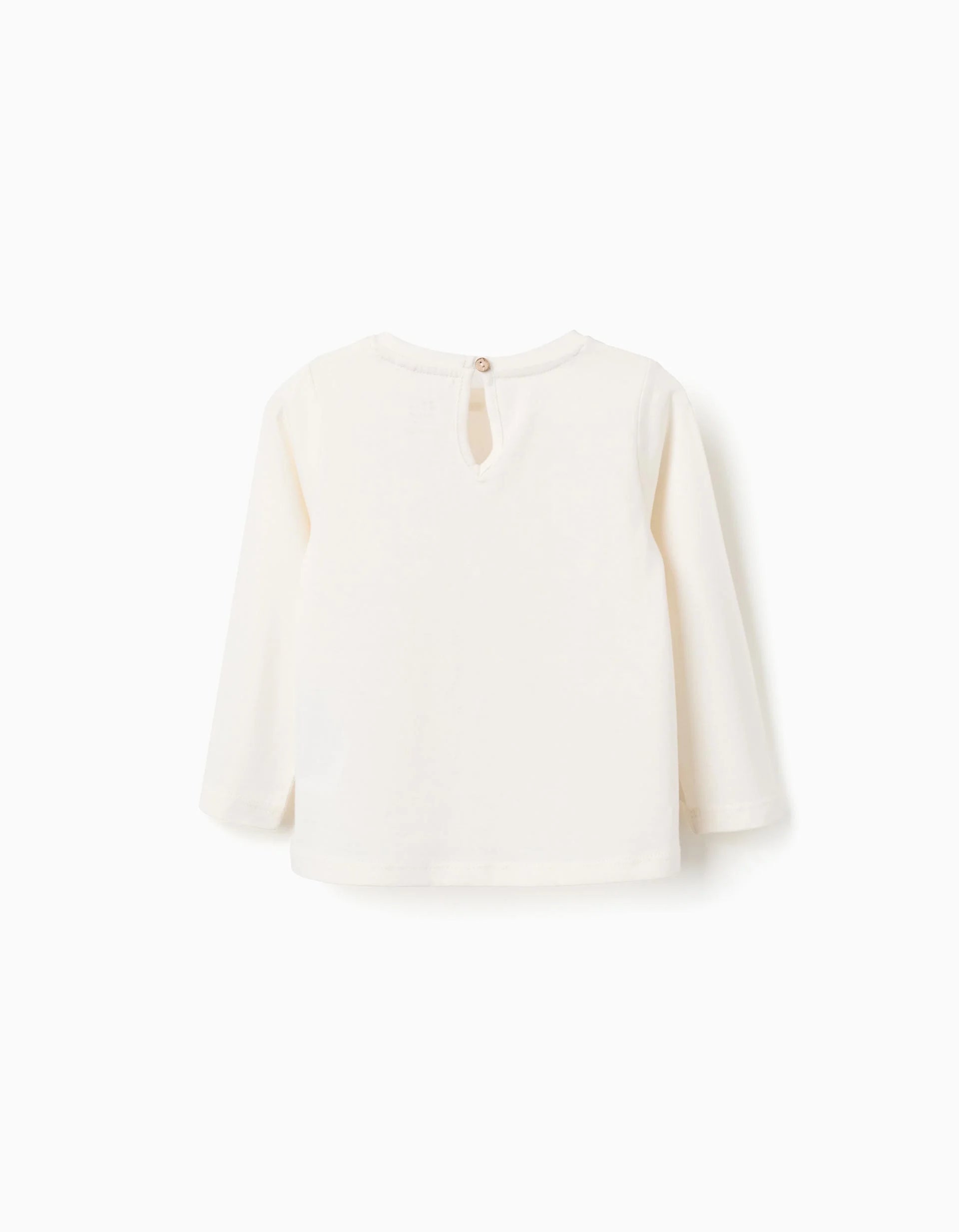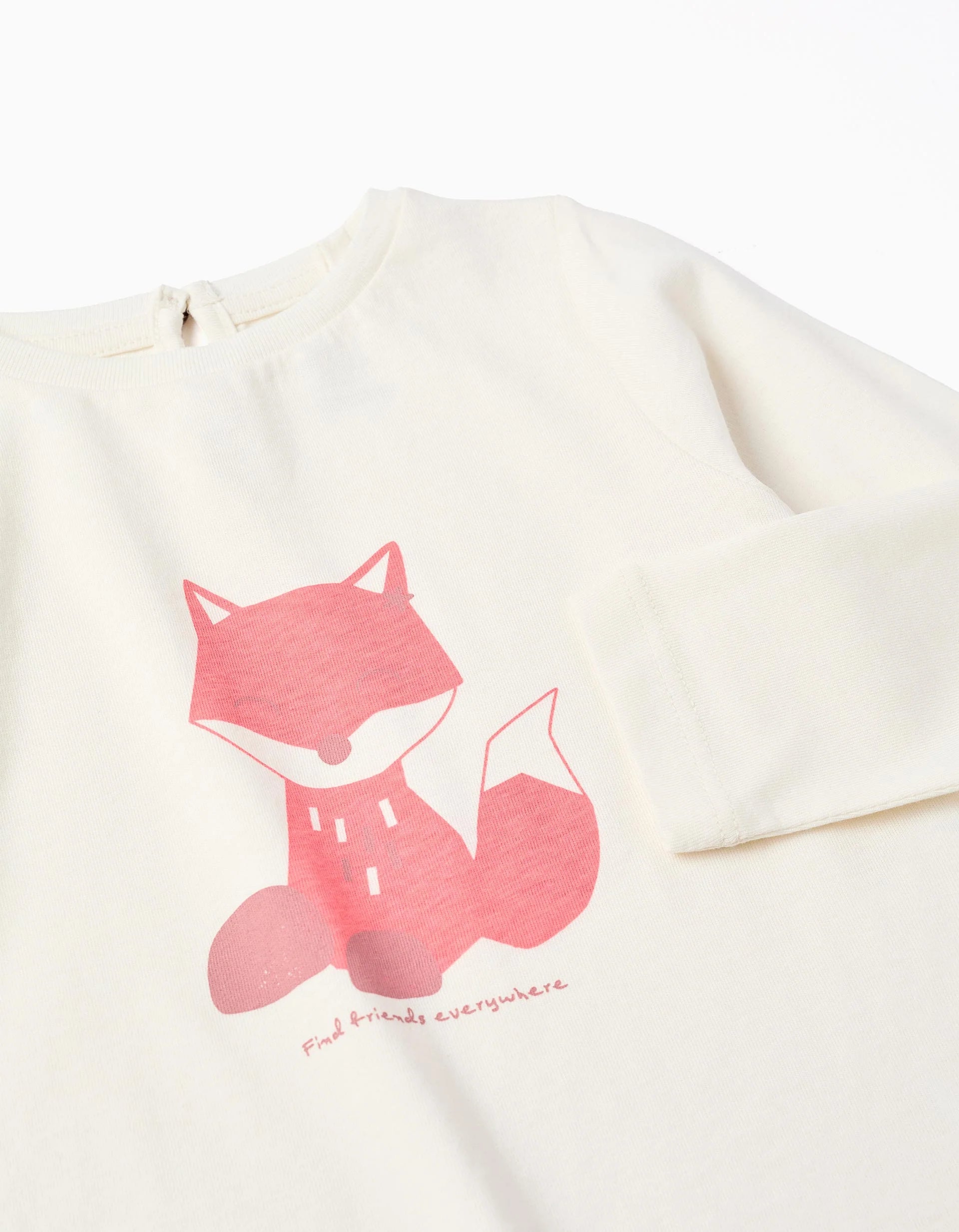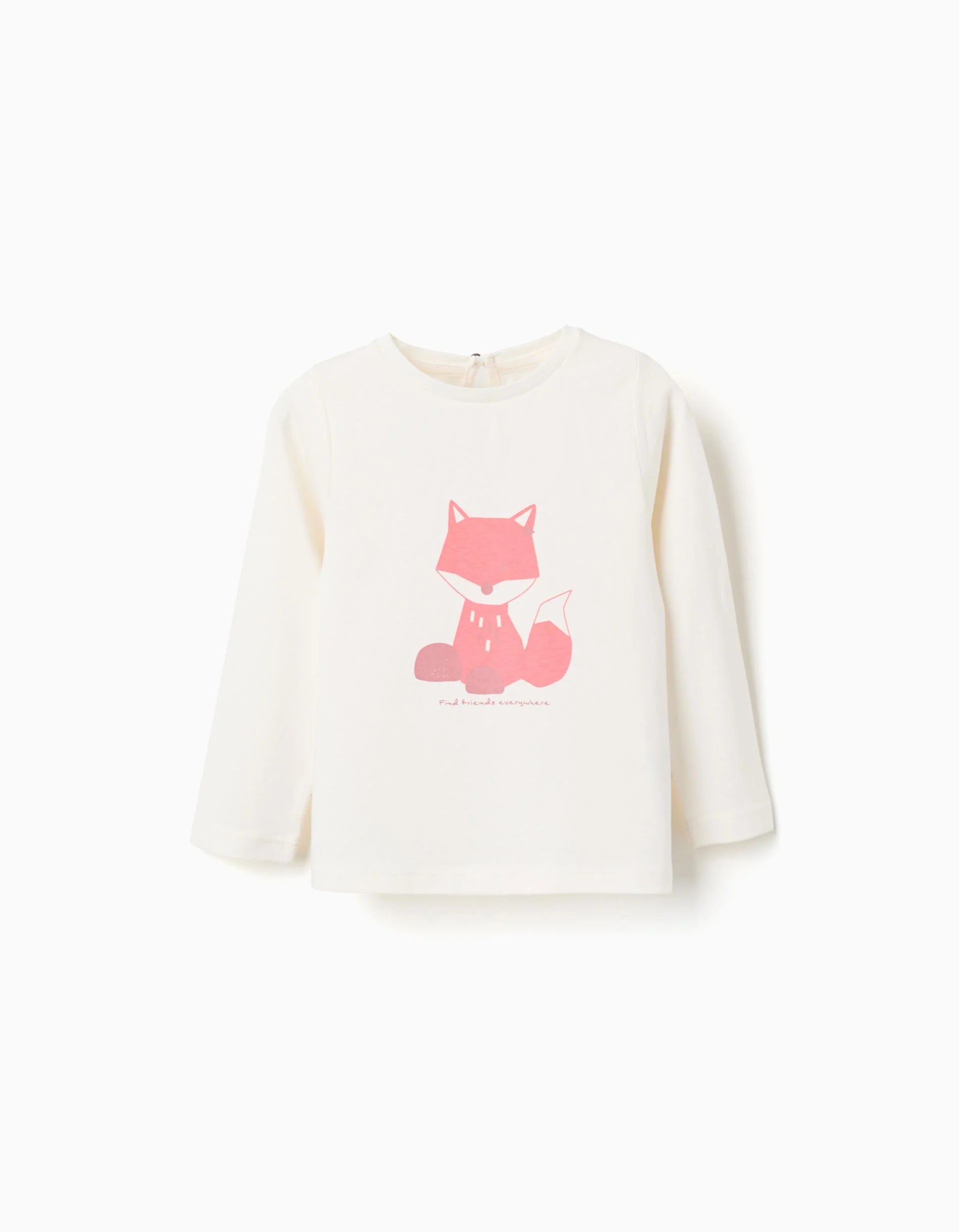 Long sleeve cotton T-shirt with fox print for baby girls, white