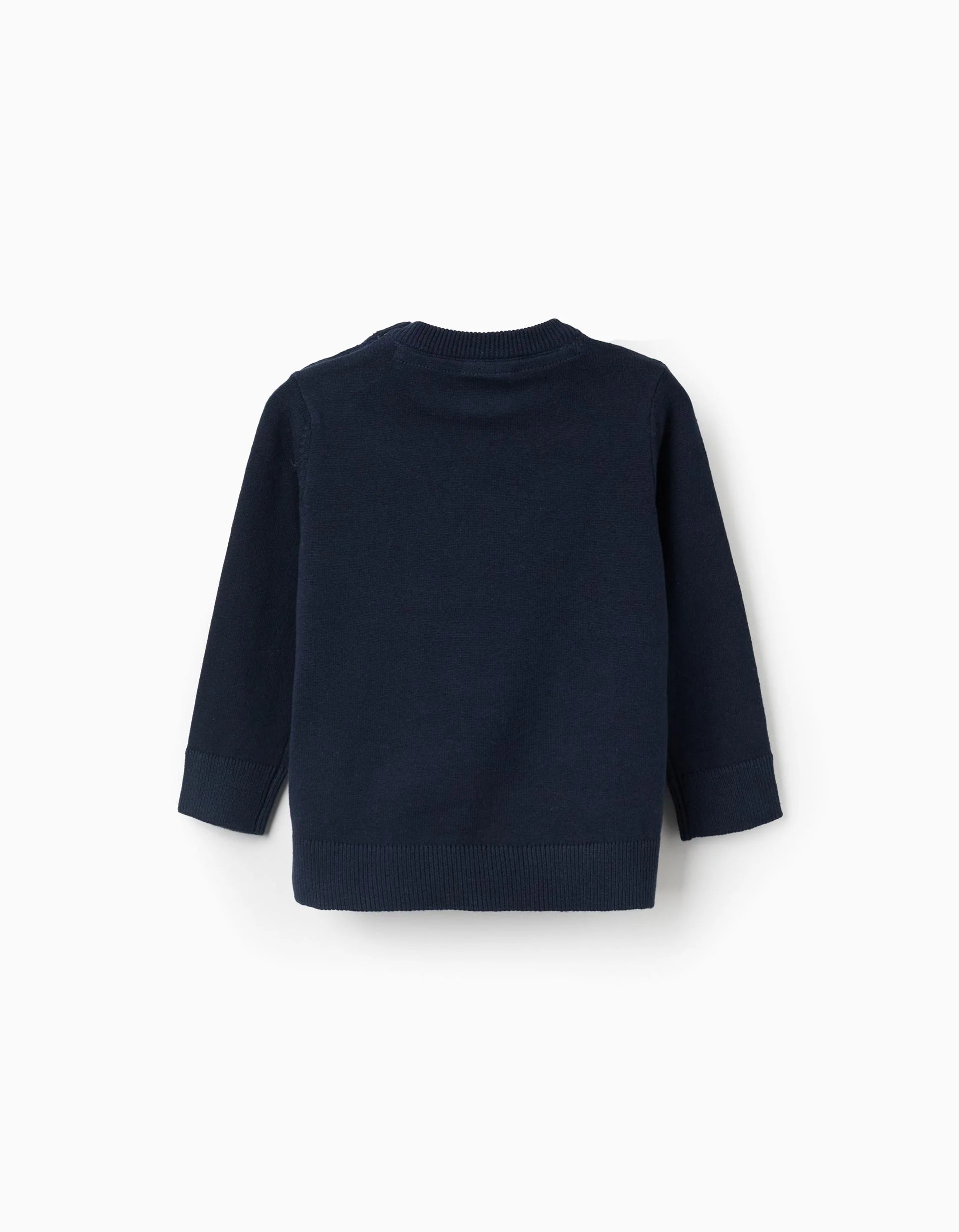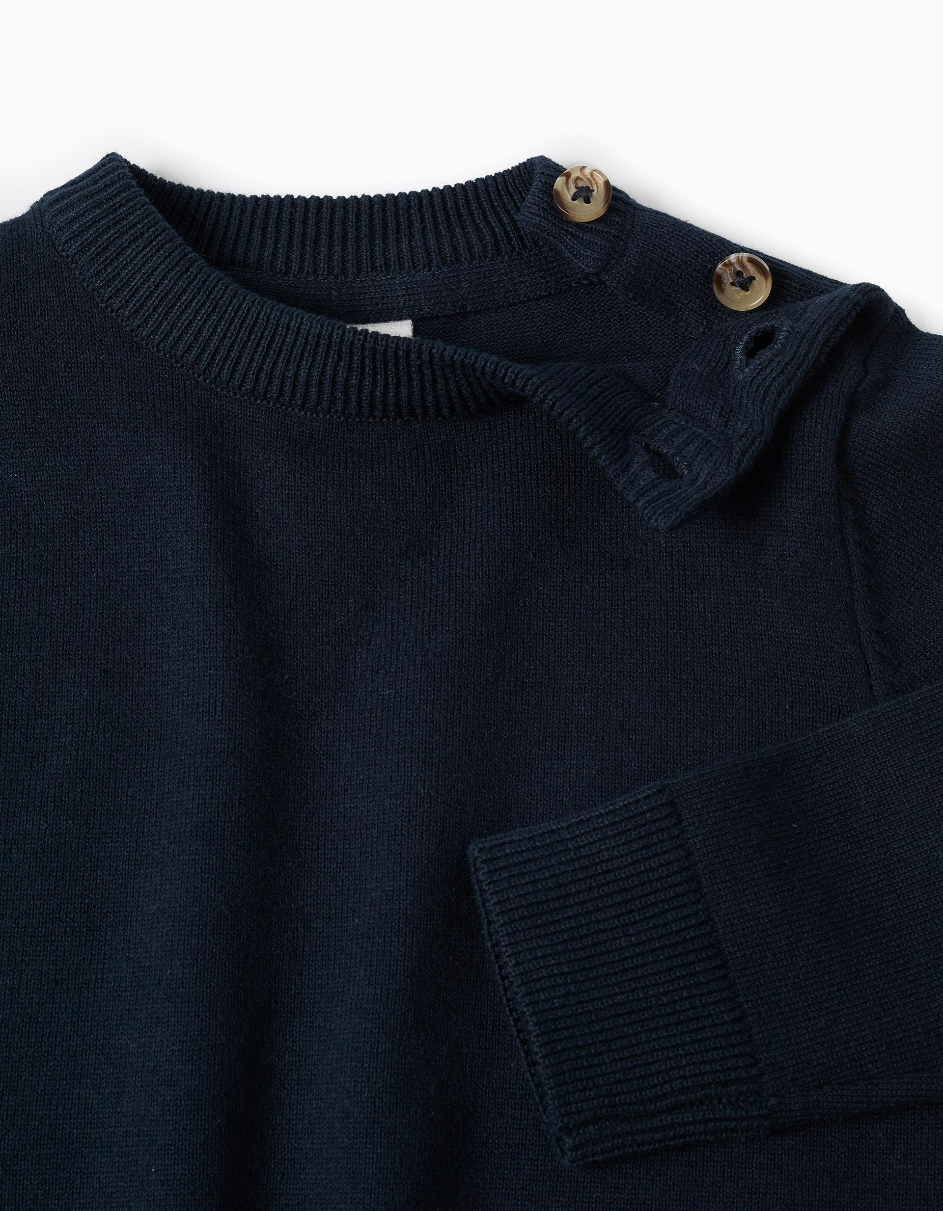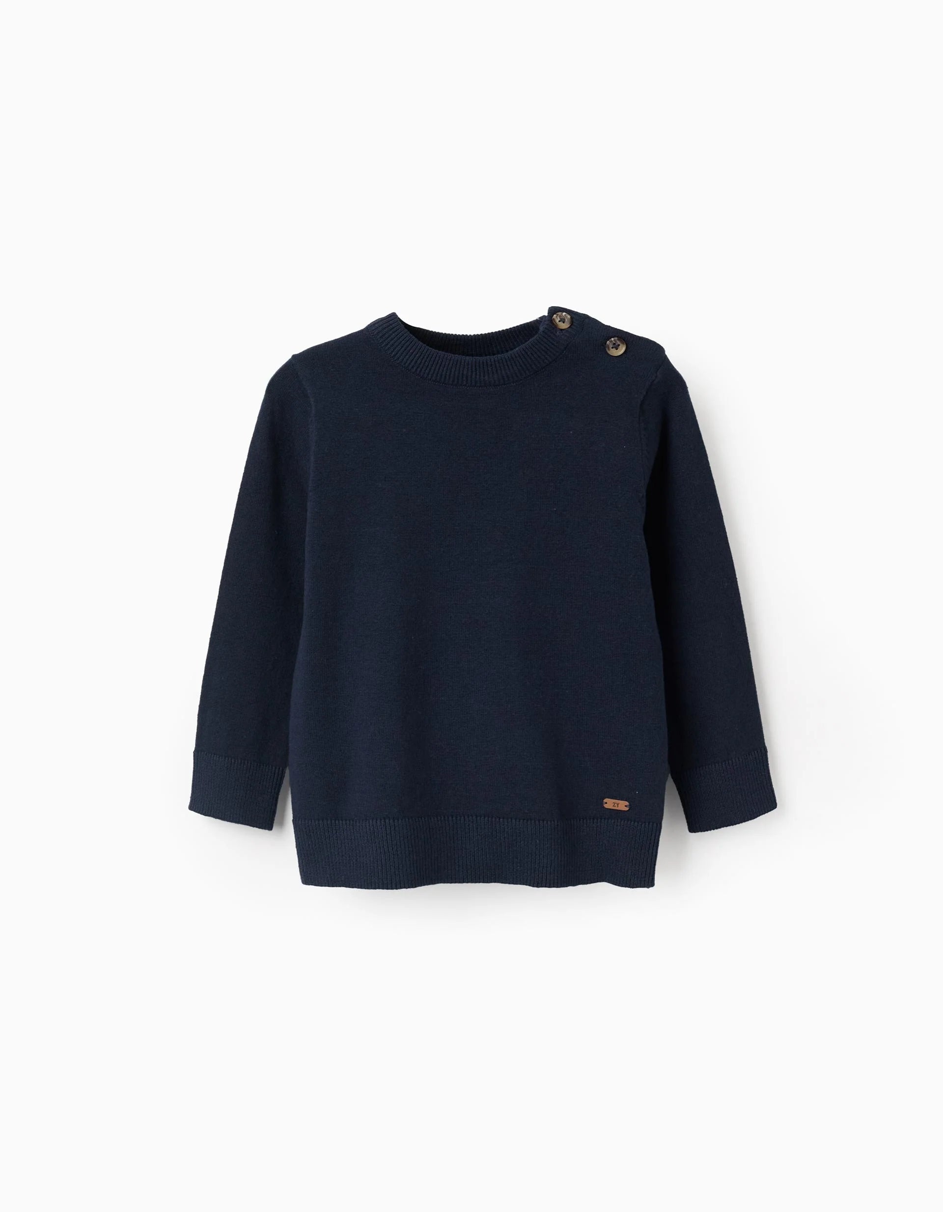 Fine dark blue jumper for boys, made from a cotton blend. Buttons on the shoulder for easy dressing. Ribbed cuffs for a perfect fit. A versatile and timeless option!