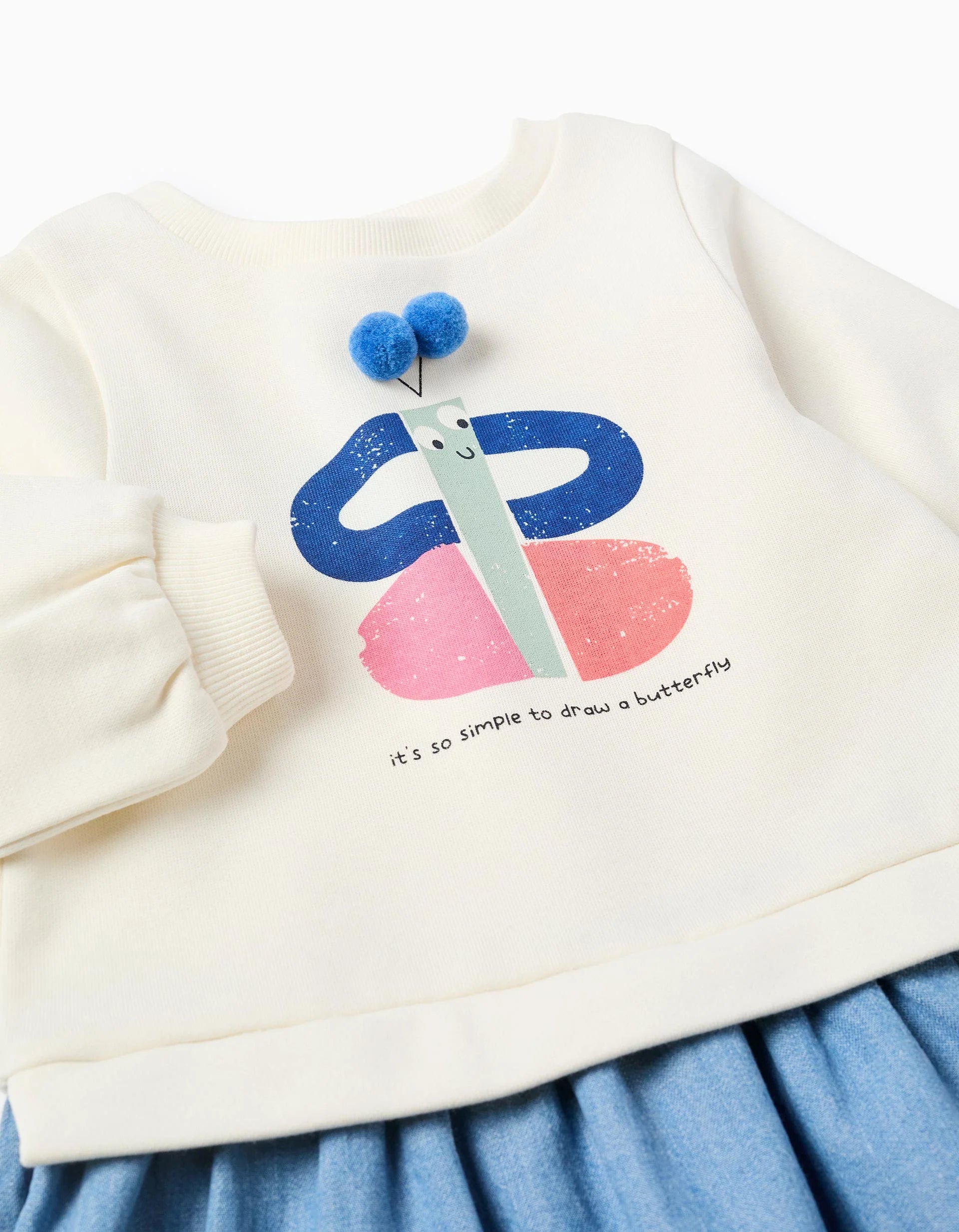 Dual-fabric dress for baby girls, with brushed interior for greater thermal comfort. Sweatshirt style top, with butterfly print and blue pom-poms. Denim skirt with gathering. Comfortable, casual and with fun details!