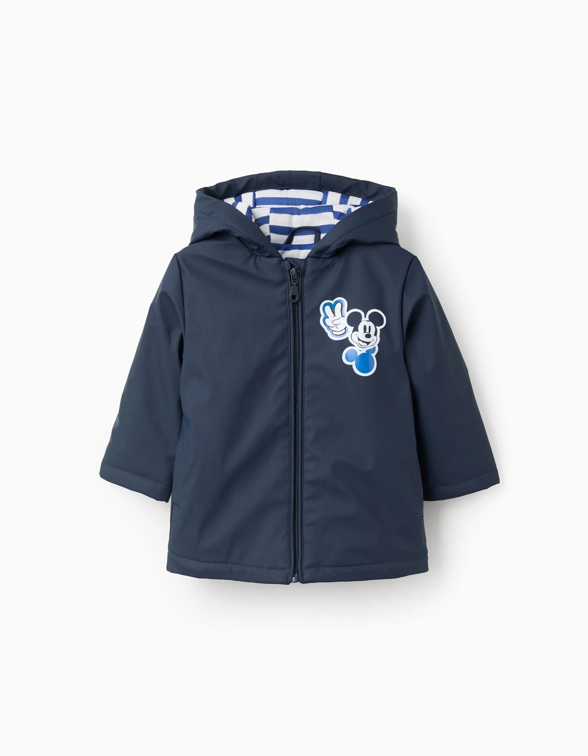 Dark blue rubber parka for baby boys with small Mickey print, with hood. Side pockets. White and blue striped jersey lining. Easy fastening with zip. Inner label to write the child's name. We Care: the filling of this piece is made of recycled polyester. The ideal jacket for rainy days.