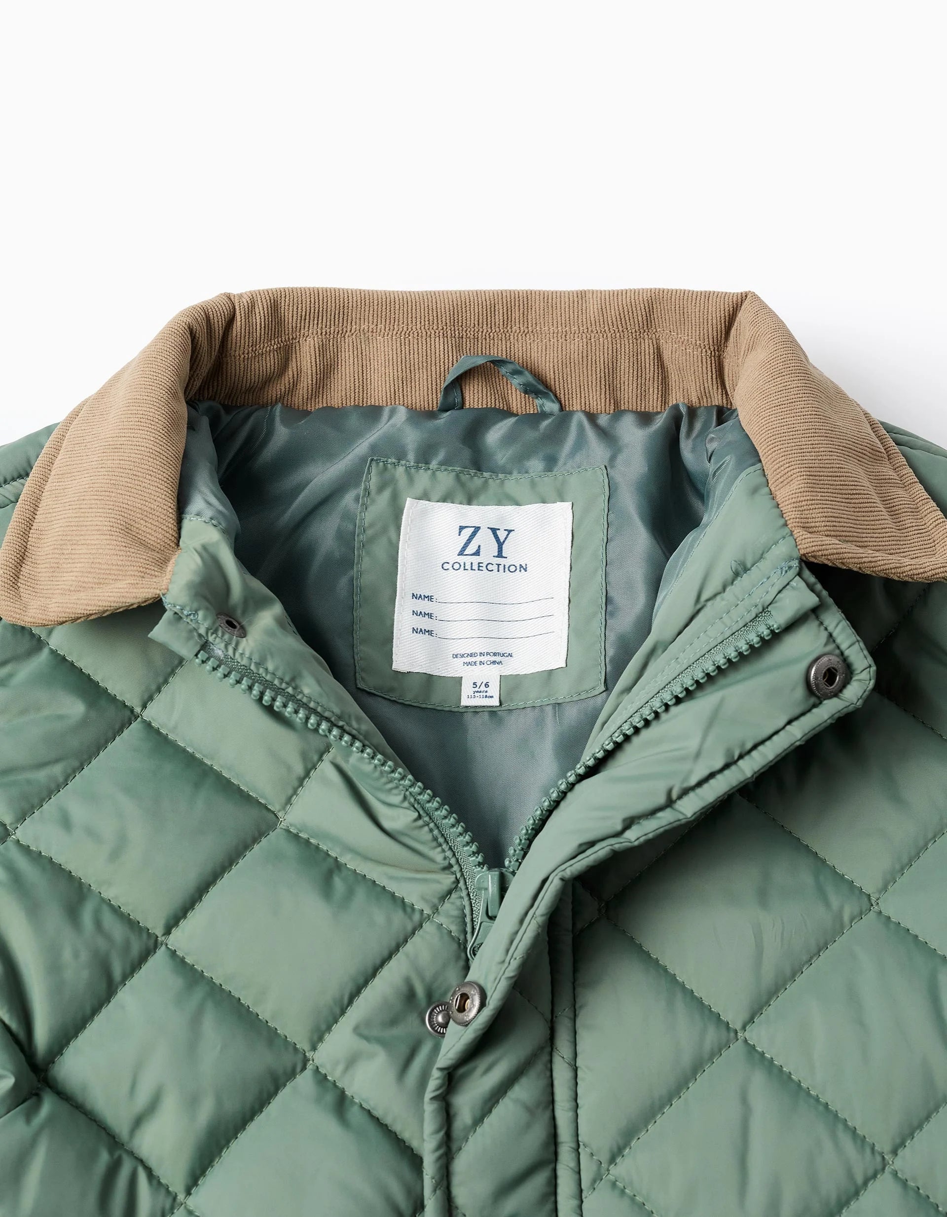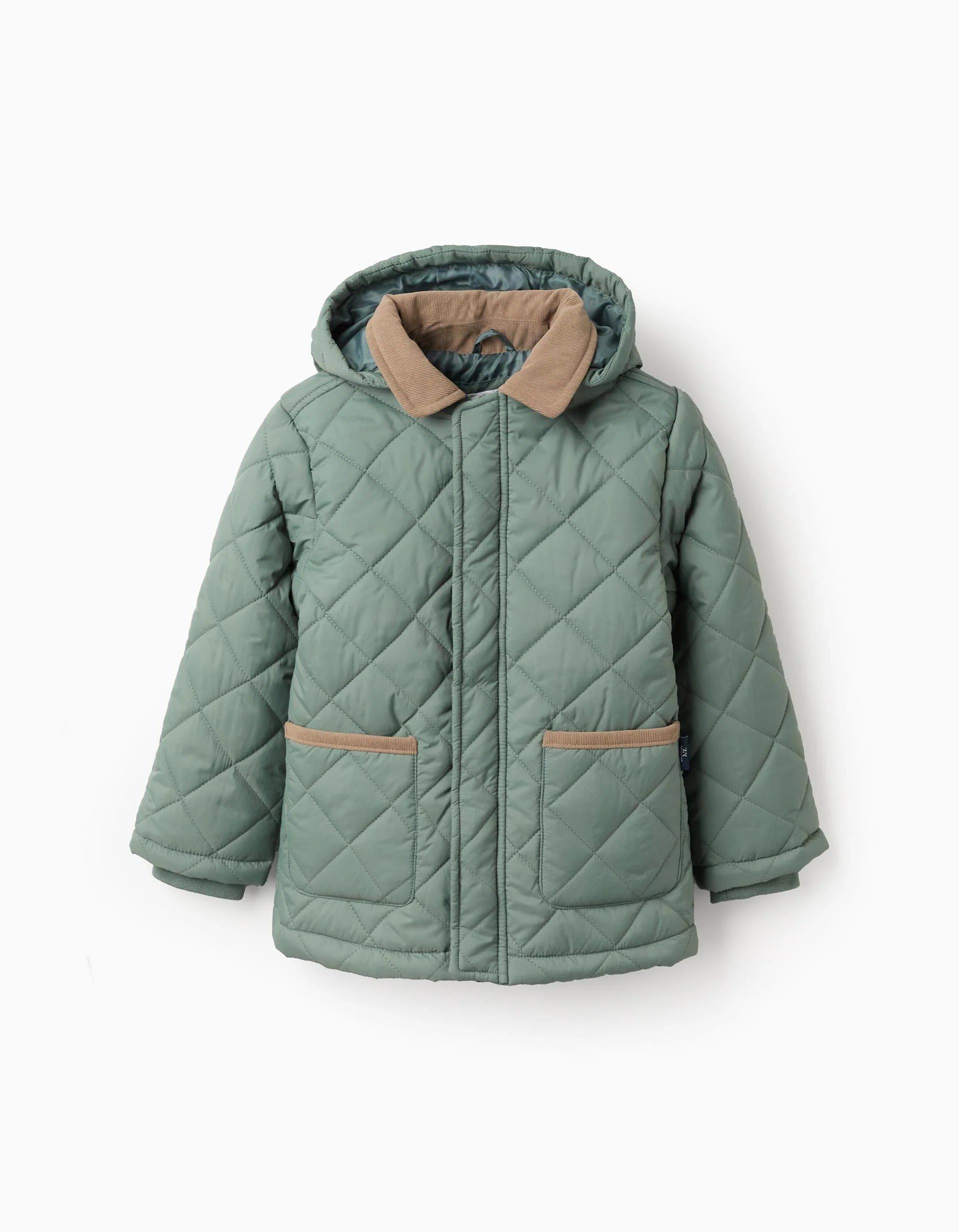Dark green quilted parka for boys with removable hood. Front pockets. Brown corduroy details on the collar and pockets for a more classic touch. Fastens with zip and snap buttons for easy dressing. Ribbed inner cuffs for a perfect fit. Inner label to write the child's name. We Care: the filling of this piece is made of recycled polyester. The ideal jacket for the winter months.