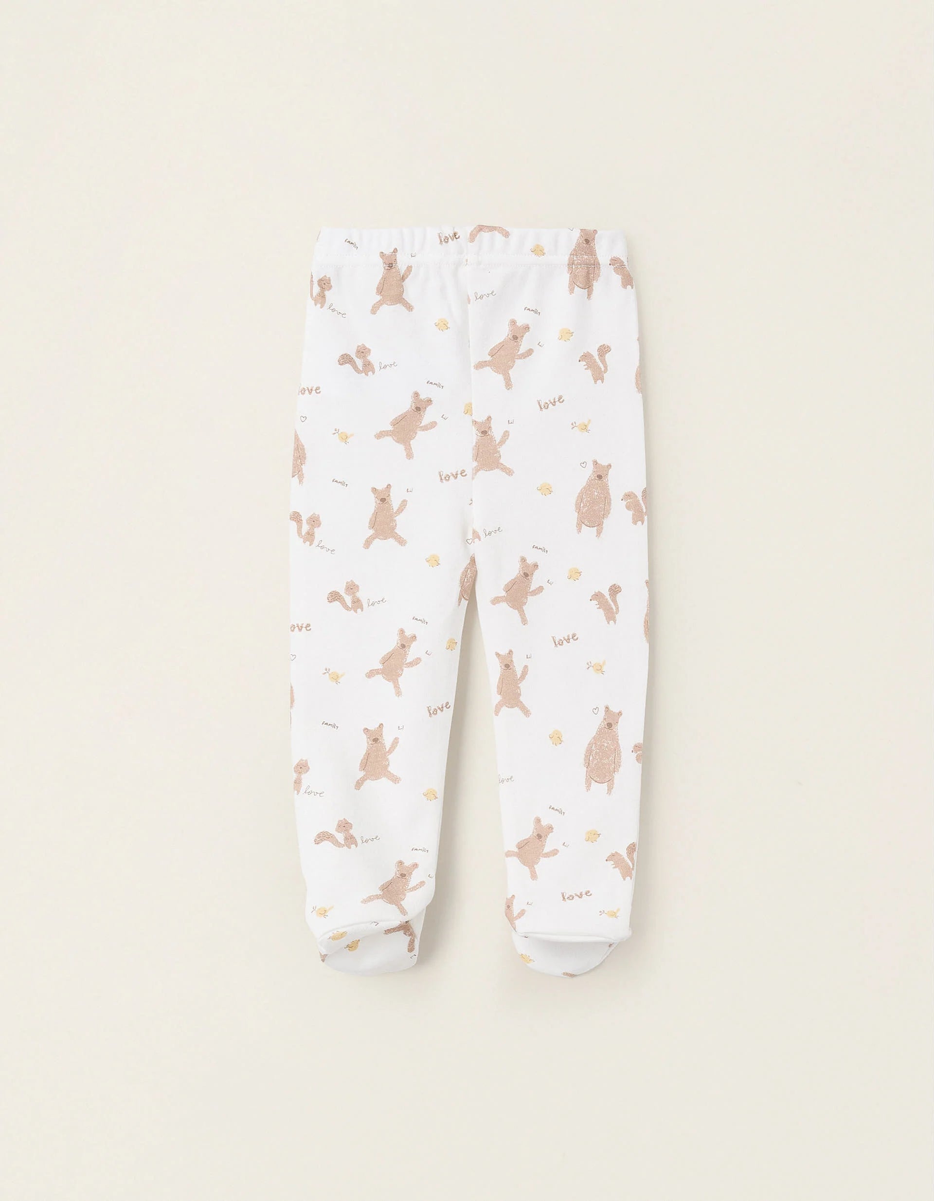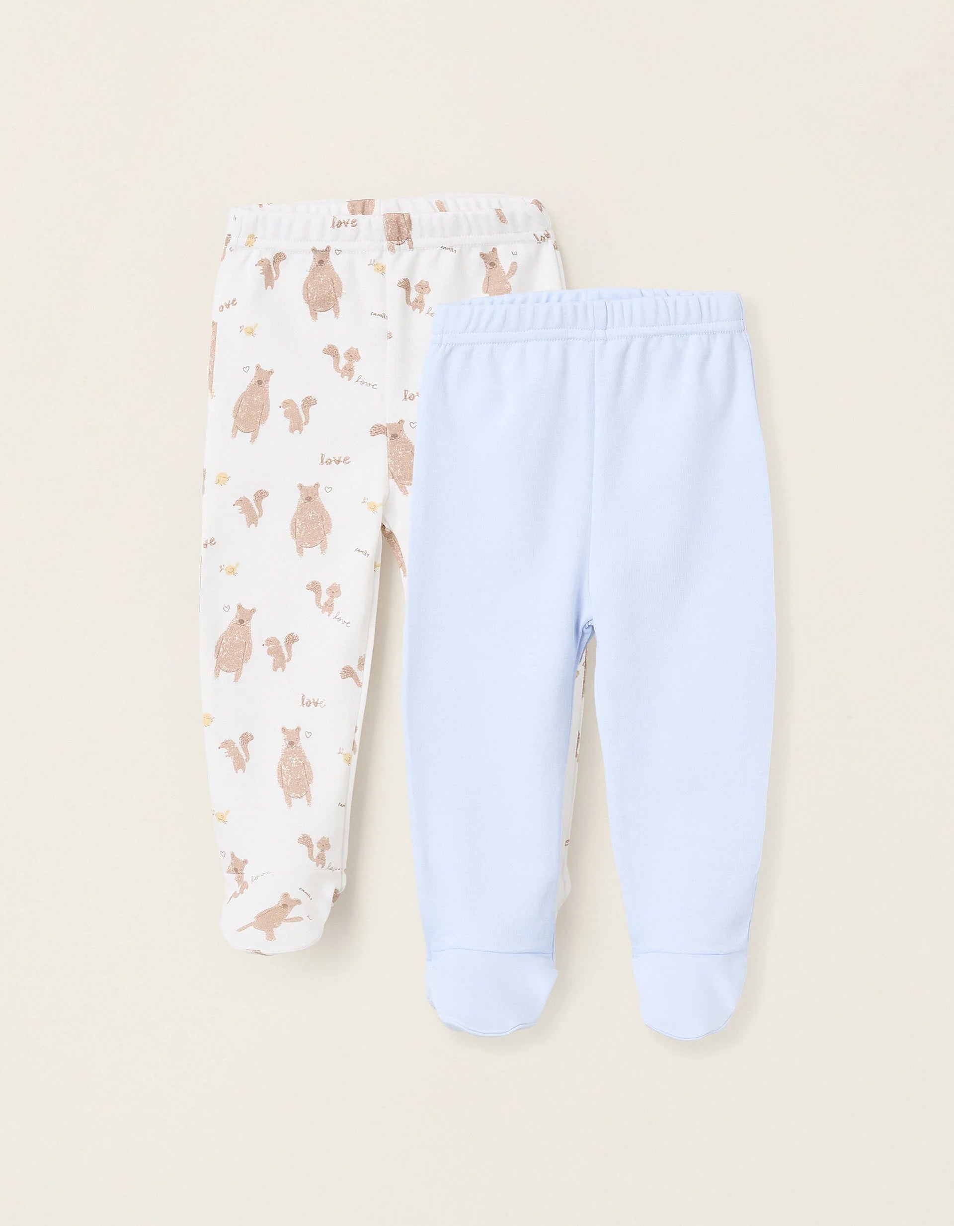 Pack of two pairs of footed trousers for baby boys, 100% cotton. Includes one plain blue pair and one white pair with a bear, squirrel and bird motif. Comfortable elastic waistband. Printed inner labels to prevent skin irritation. A soft and comfortable set of underwear, ideal for everyday wear!