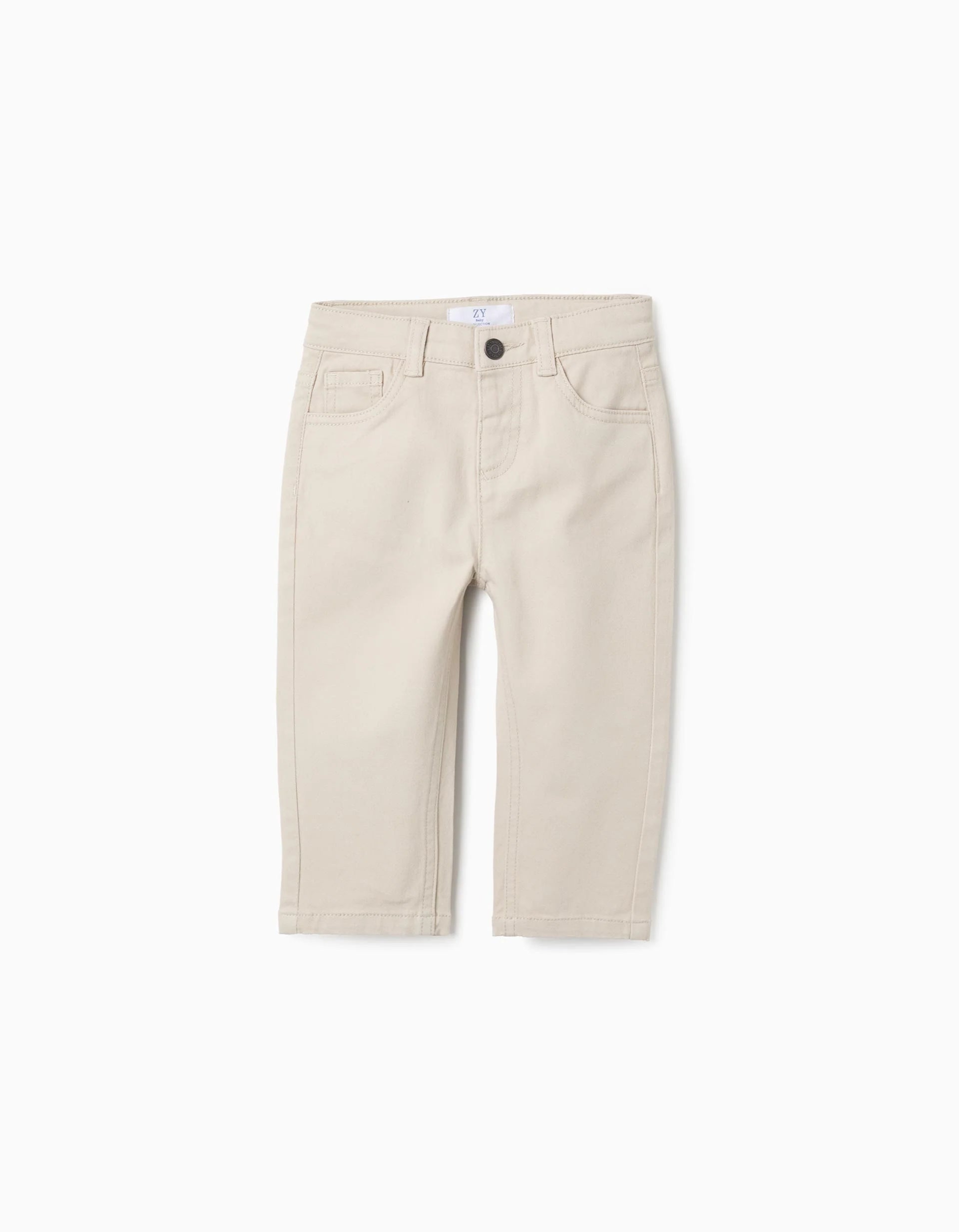 Beige twill trousers for baby boys, made of cotton with a touch of stretch for greater comfort and freedom of movement. Five pockets. Adjustable inner waistband with elastics and buttons. Snap button for easy dressing. A wardrobe essential!