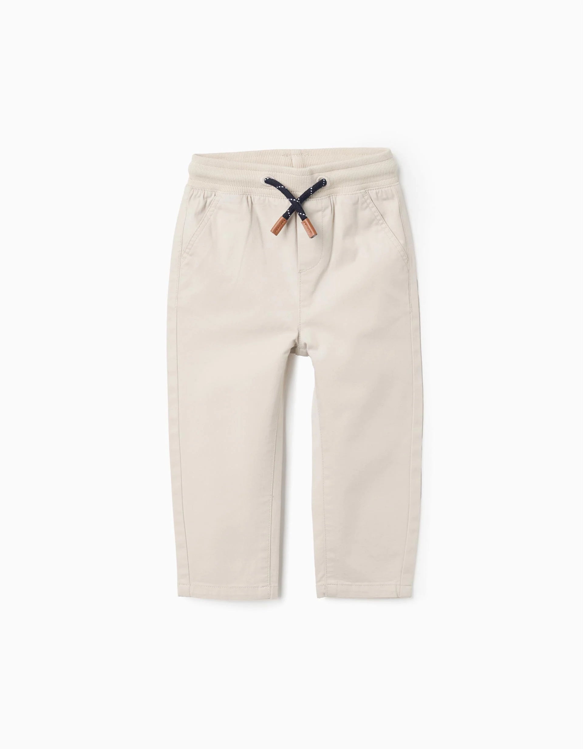 Beige twill trousers for baby boys, made of cotton with a touch of stretch for greater comfort and freedom of movement. Ribbed, flexible and comfortable waistband with adjustable drawstring. Side pockets. A practical and versatile option!