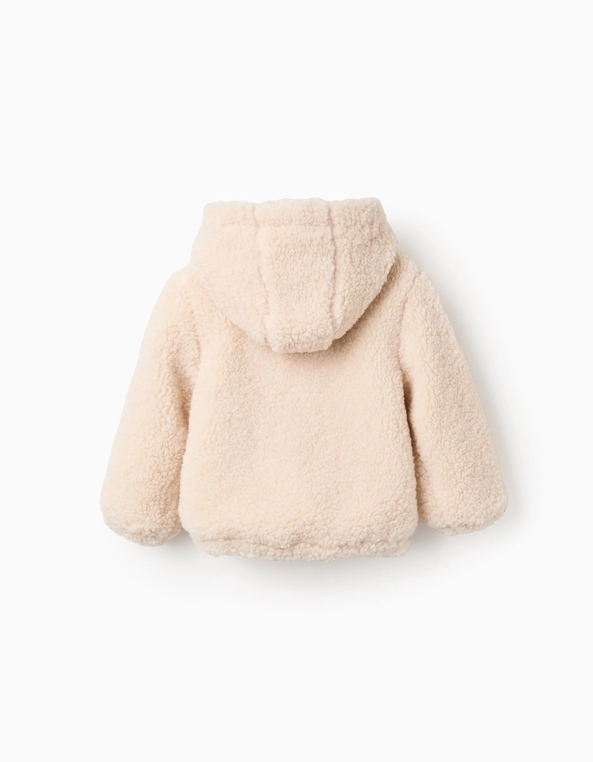 Beige sherpa hooded jacket for baby boys. Side pockets. Elastic cuffs and hem for a perfect fit. Easily fastens with a zip. Inner label to write the child's name. A versatile and cosy option.