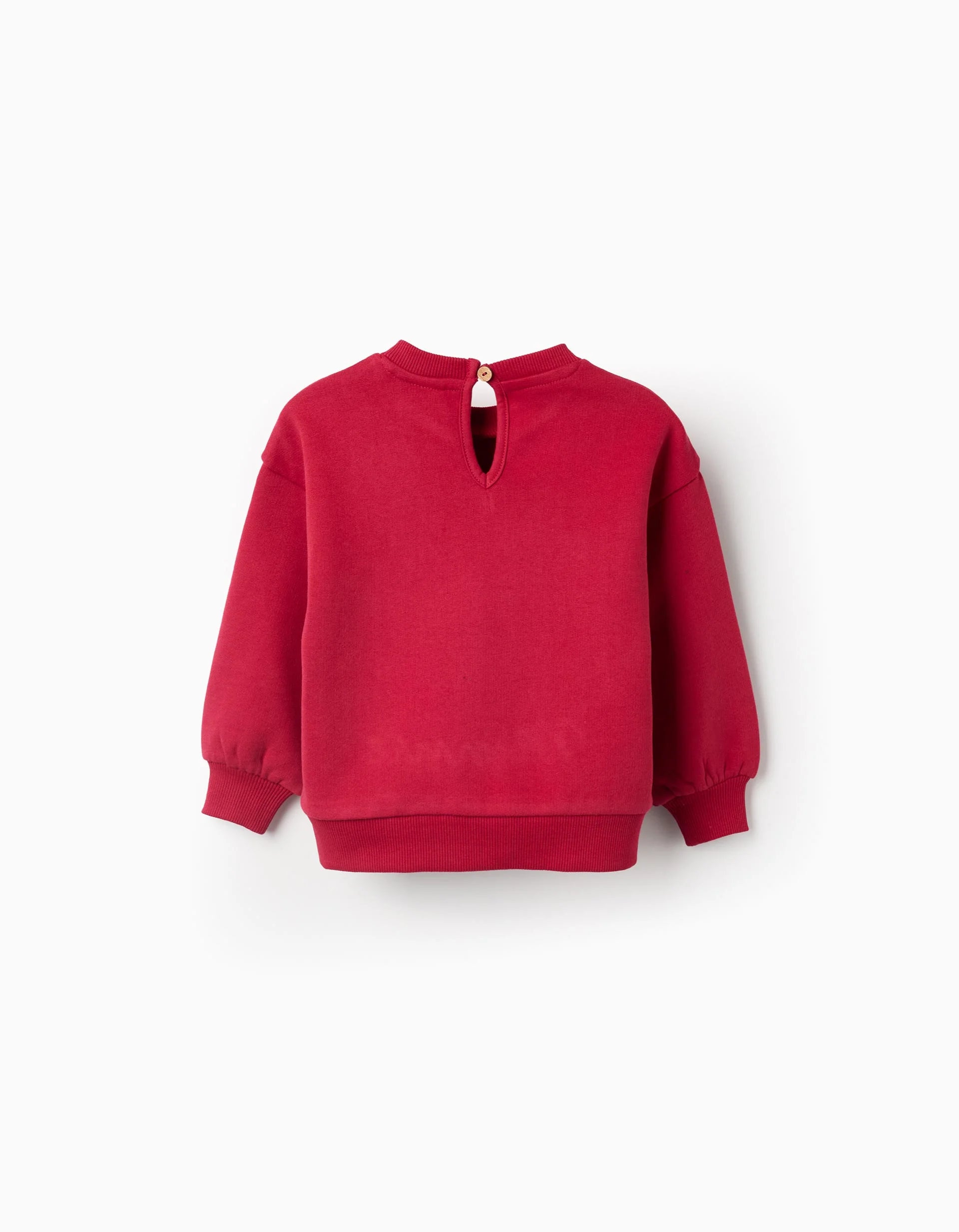 Red fleece sweatshirt for baby girls, with a front print of Minnie with raised rope details. Ribbed edges for a perfect fit. Button at the back for easy dressing. A practical and cosy sweatshirt, perfect for the festive season!