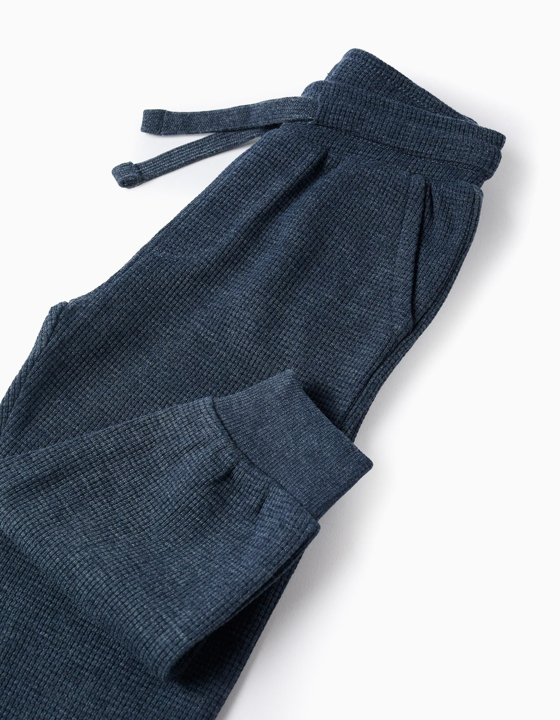 Dark blue joggers for baby boys, with a waffle texture. Elasticated waistband with adjustable drawstring. Side pockets. Ribbed cuffs for a perfect fit. A soft and comfortable option!