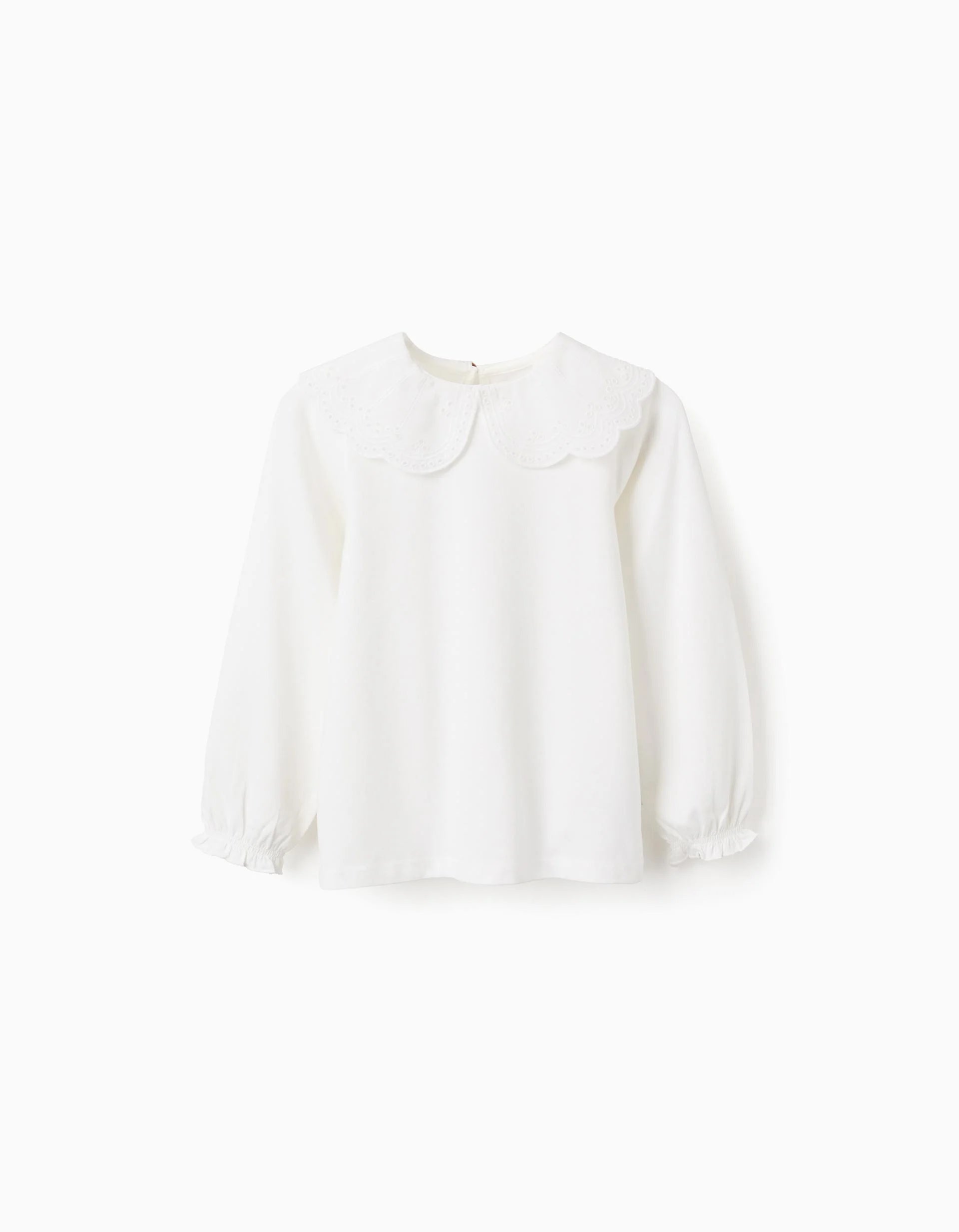 T-shirt with Broderie Anglaise Collar and Ruffles for Girls, White