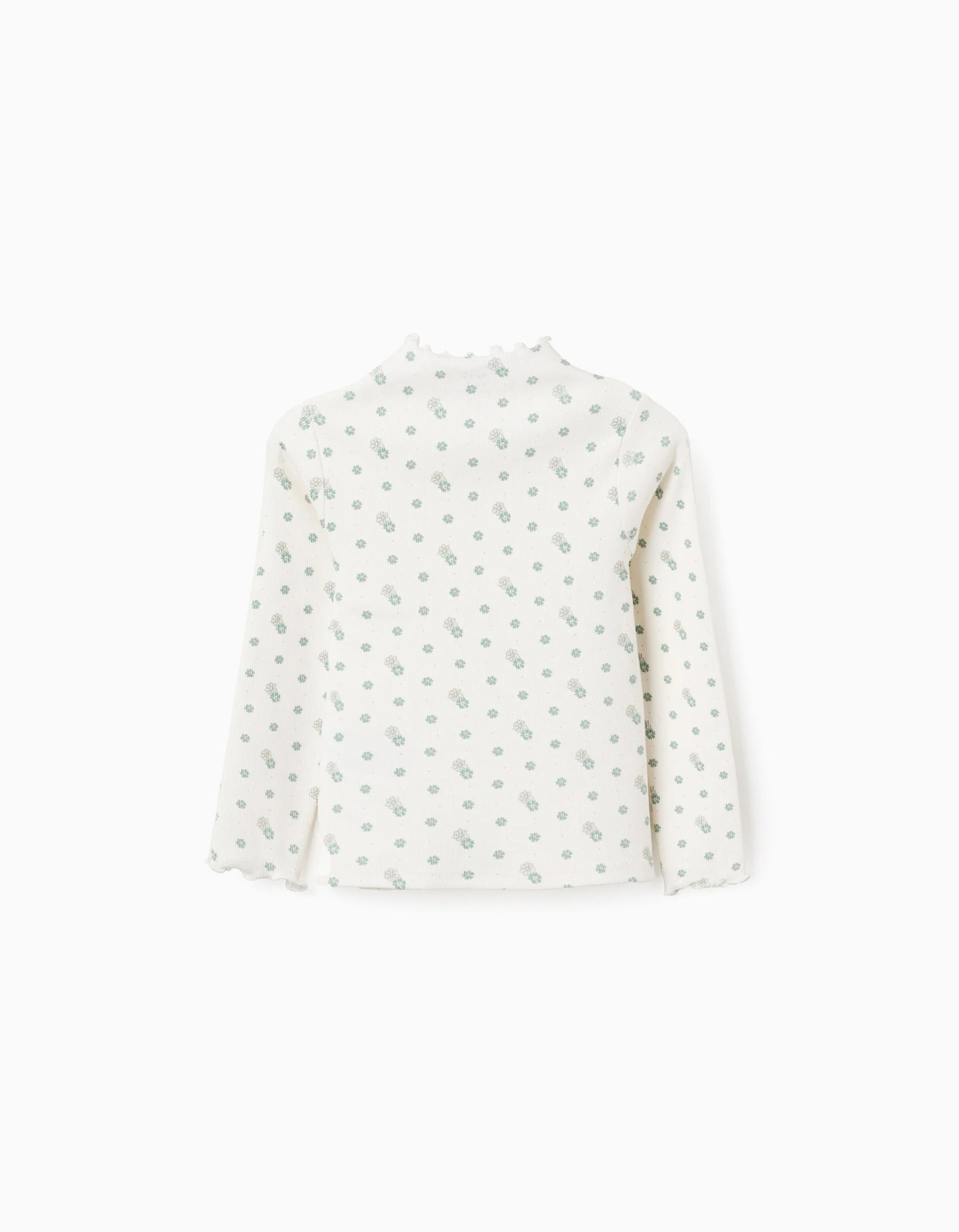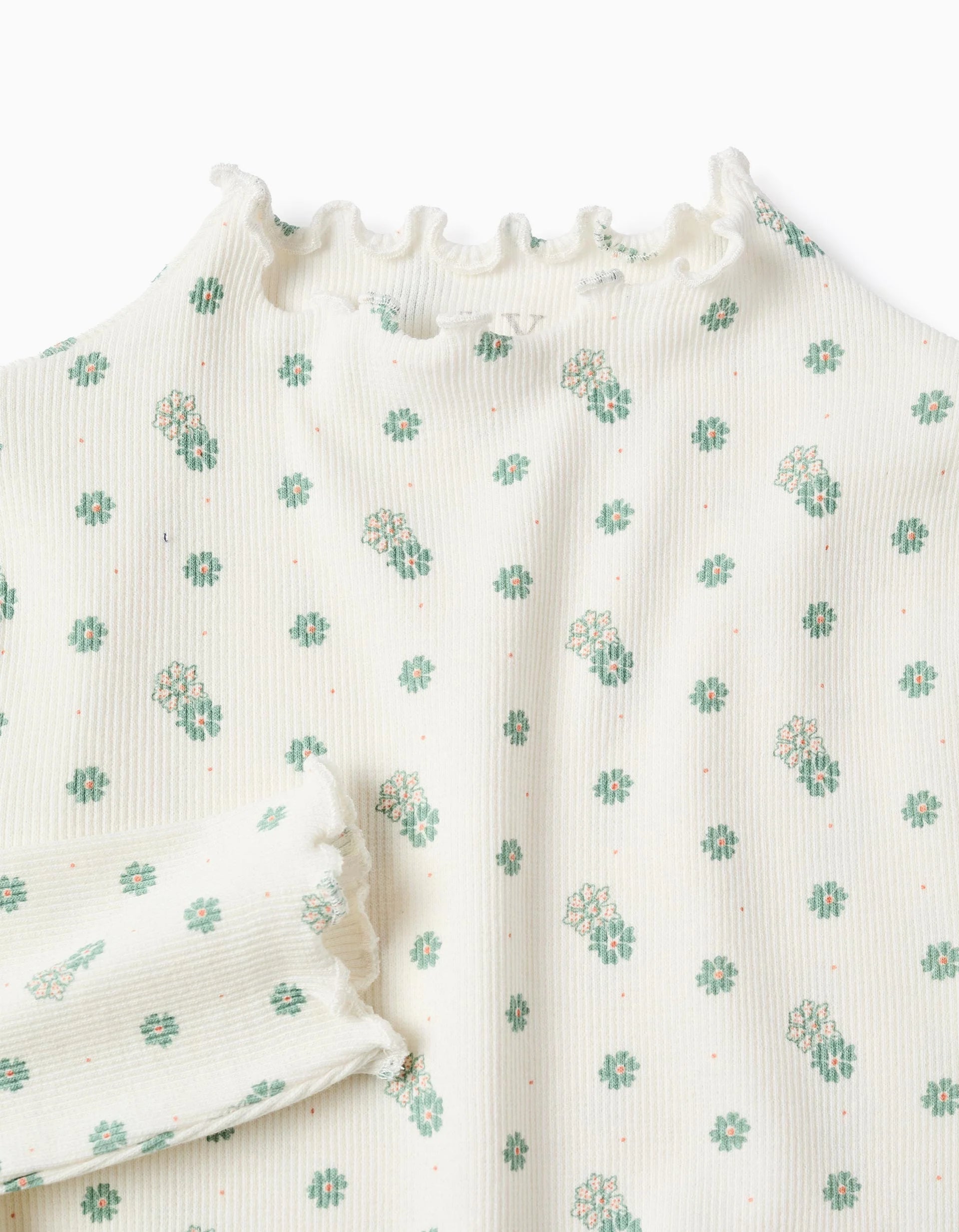 White long sleeve ribbed T-shirt for girls. Wavy edges. Green flower motif for a cheerful touch. Printed inner labels to avoid irritating the skin. For everyday looks! We Care: Oeko-Tex Standard 100 certified item, ensuring the absence of harmful or irritating substances for the skin.