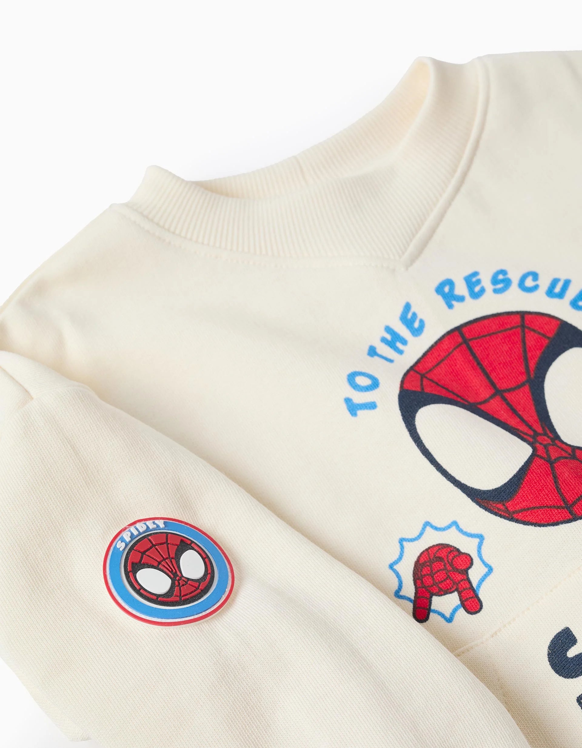 Beige sweatshirt for baby boys, with brushed interior for greater thermal comfort. Spidey print, kangaroo pocket and dropped shoulders. Embossed rubber symbol on the sleeve. Ribbed cuffs for a perfect fit. The perfect sweatshirt for Spidey fans!