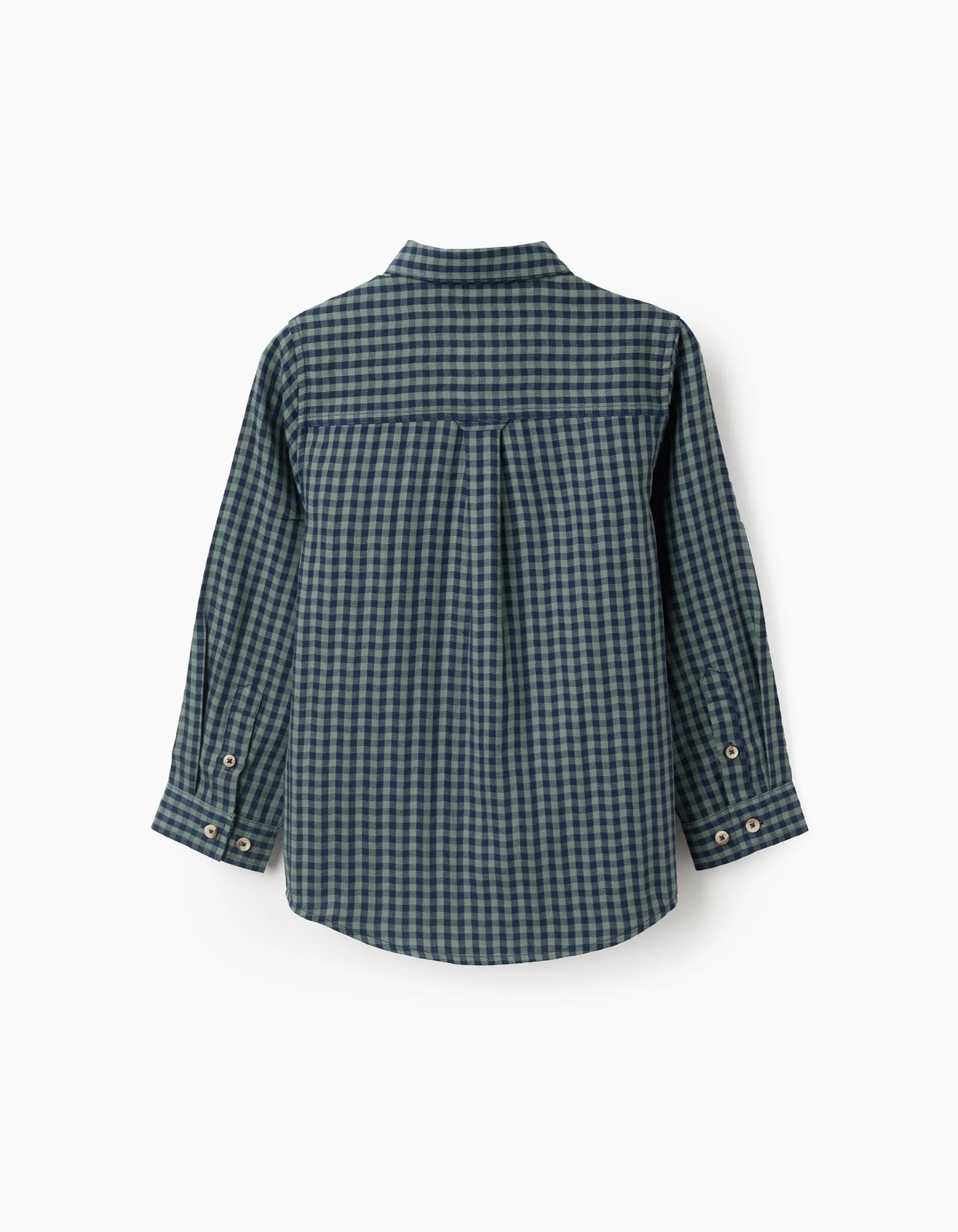 Green and dark blue Vichy patterned shirt for baby boys, 100% cotton. Contrasting buttons. Rounded hem. A versatile and stylish option! Big Me: a button with contrasting thread and buttonhole so that the child can easily identify where to start buttoning up, promoting their independence.