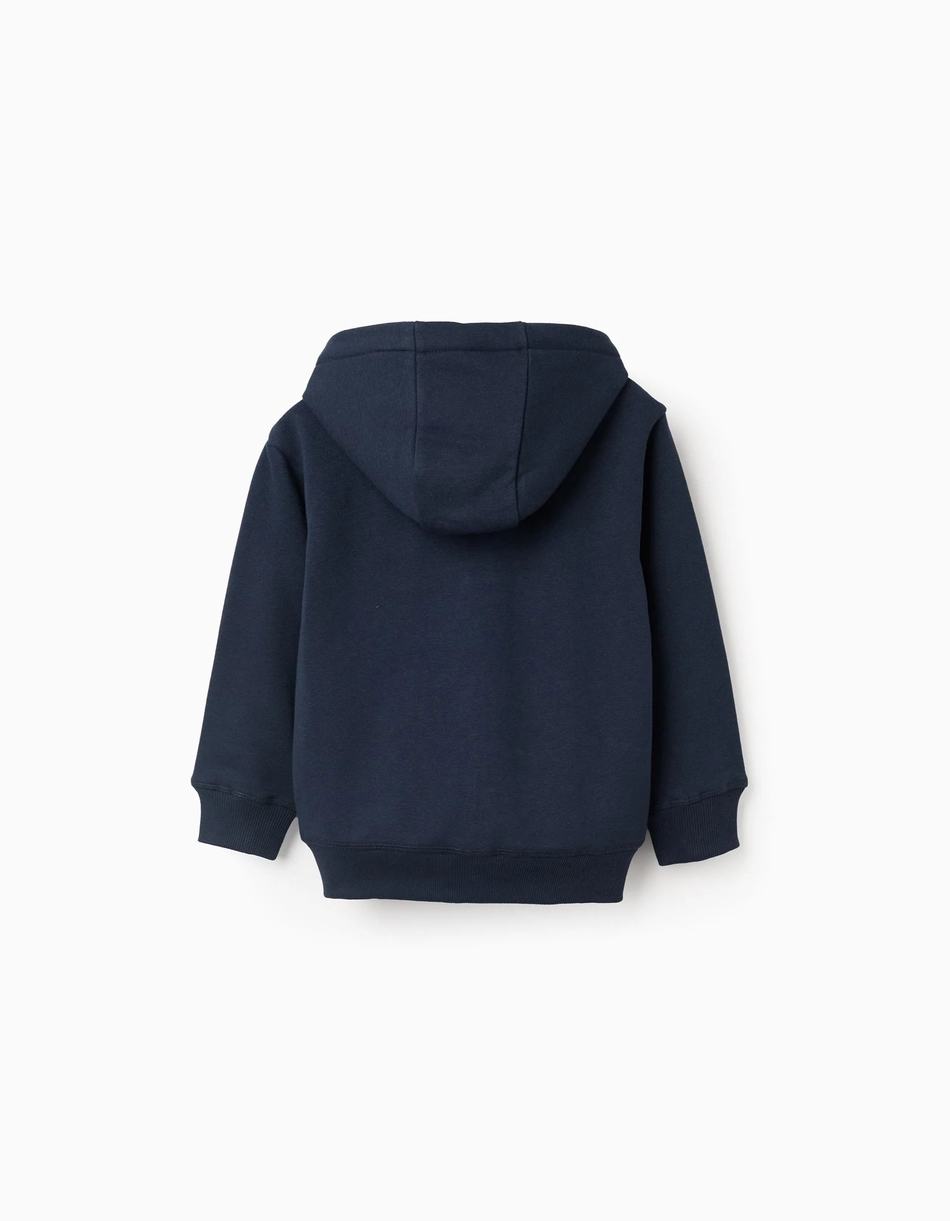 Dark blue jacket for boys. With a brushed lining, in a soft and comfortable cotton blend. Grey jersey-lined hood with blue and white striped outline. Embossed branding detail on the front. Kangaroo pocket. Ribbed edges for a perfect fit. For comfortable and stylish looks!