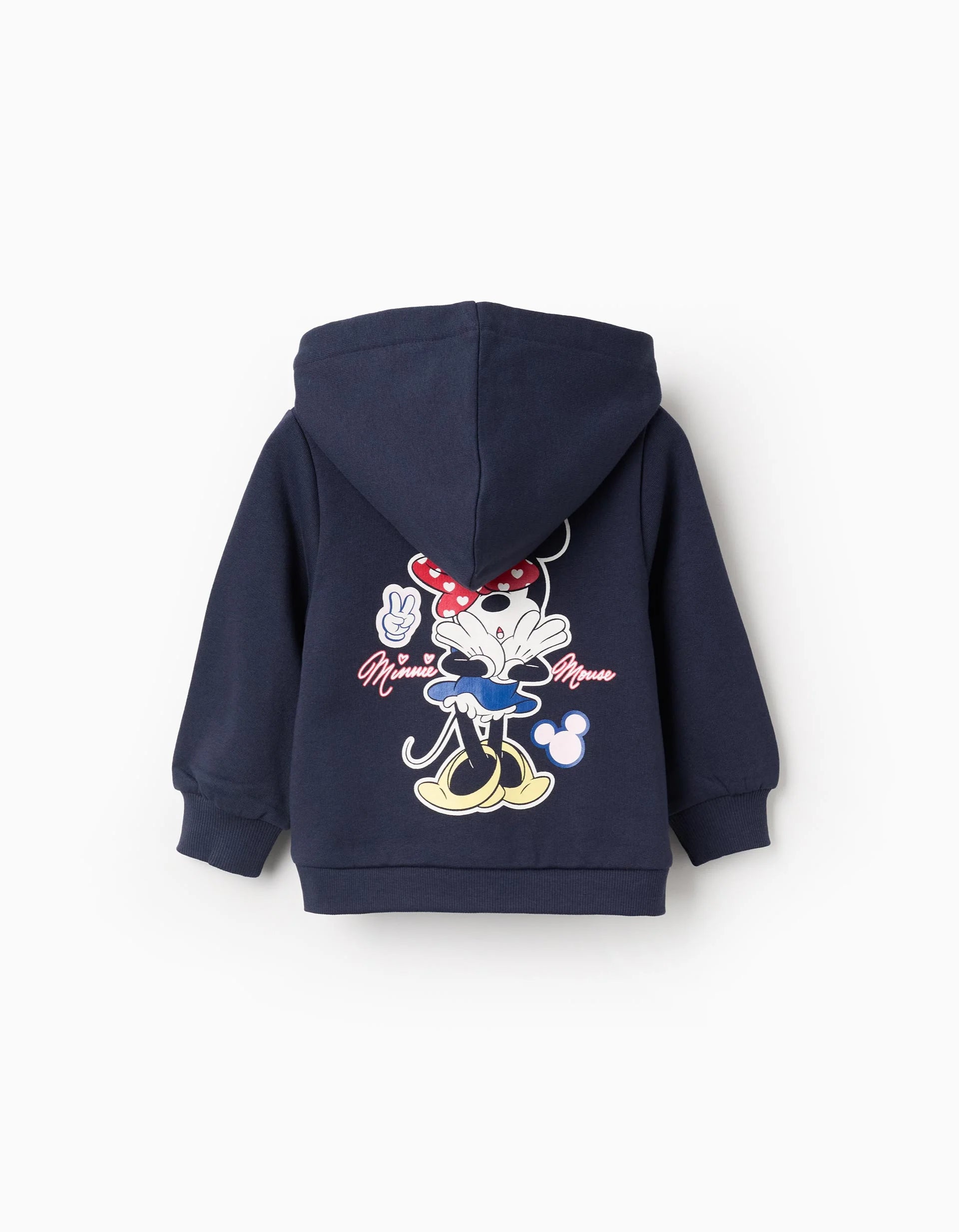 Dark blue hooded jacket for baby girls, 100% cotton. Hood lined with white and red striped jersey. Mini Minnie print on the chest and highlighted print on the back. Fastens with a zip. Ribbed cuffs for a perfect fit. Ideal for everyday wear!