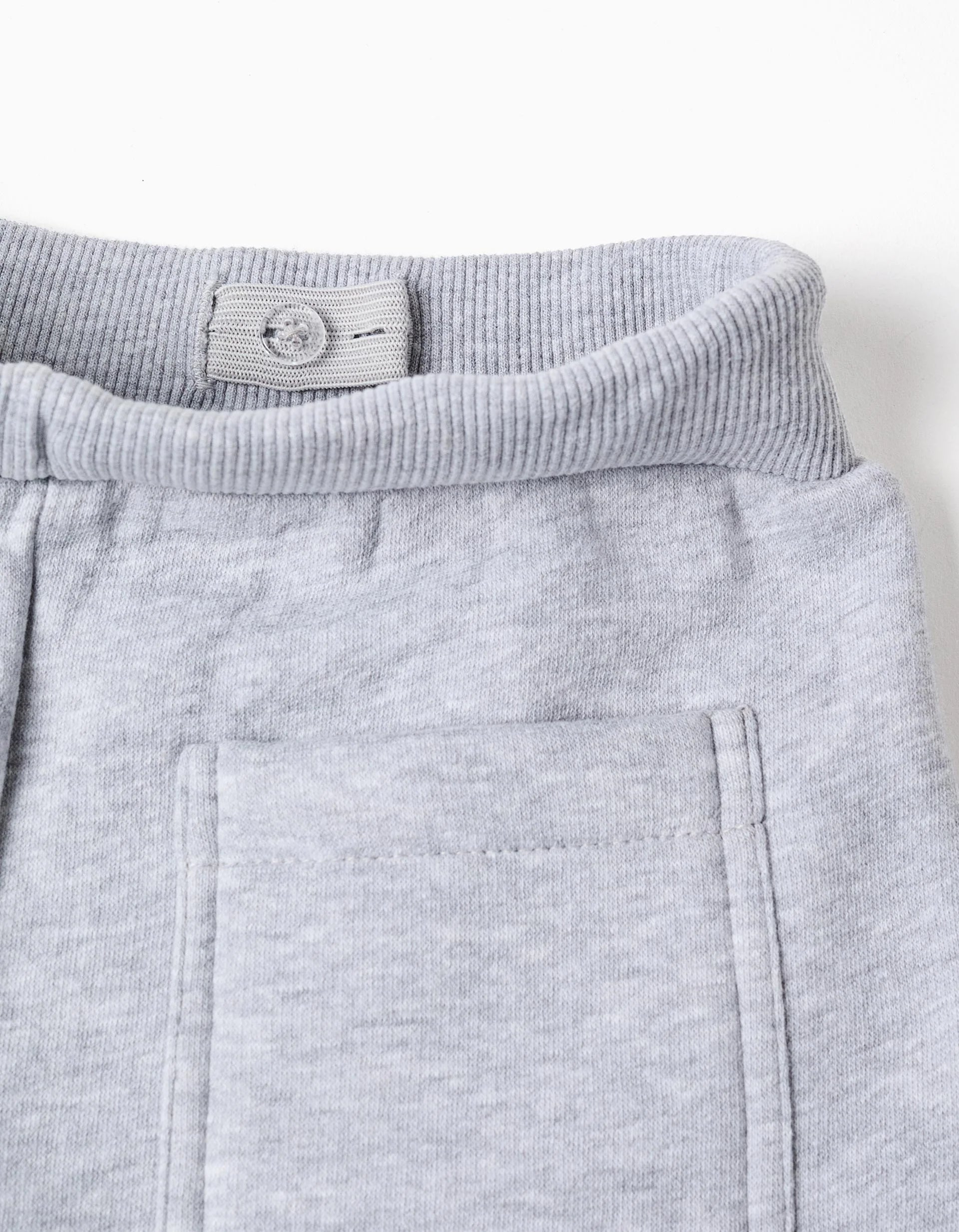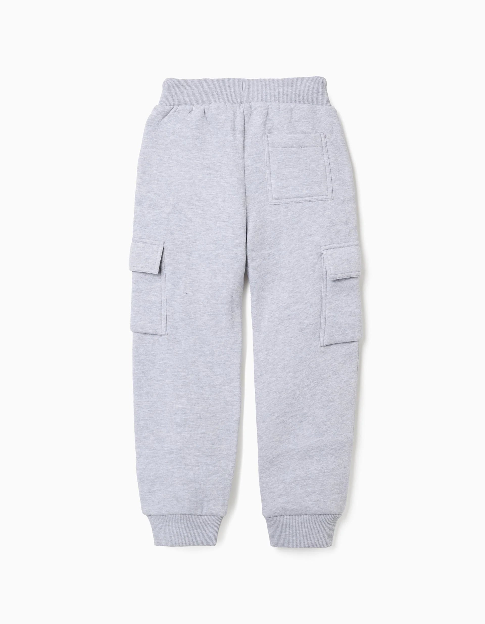 Grey joggers for boys, made of a cotton blend. Five pockets, two of them cargo. Ribbed ends for a perfect fit. Waistband with functional drawstring. Print on the left leg. An essential item in a child's wardrobe.