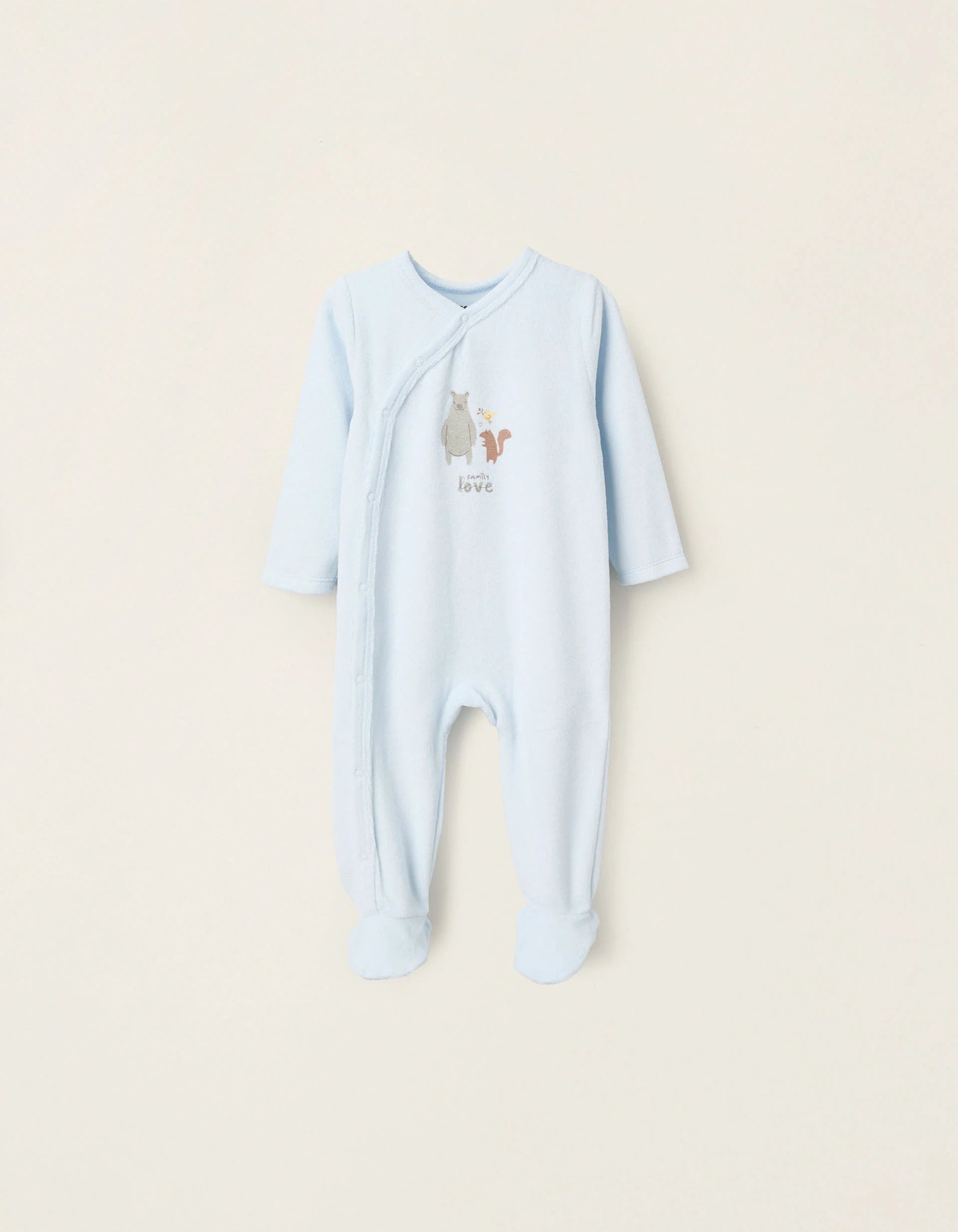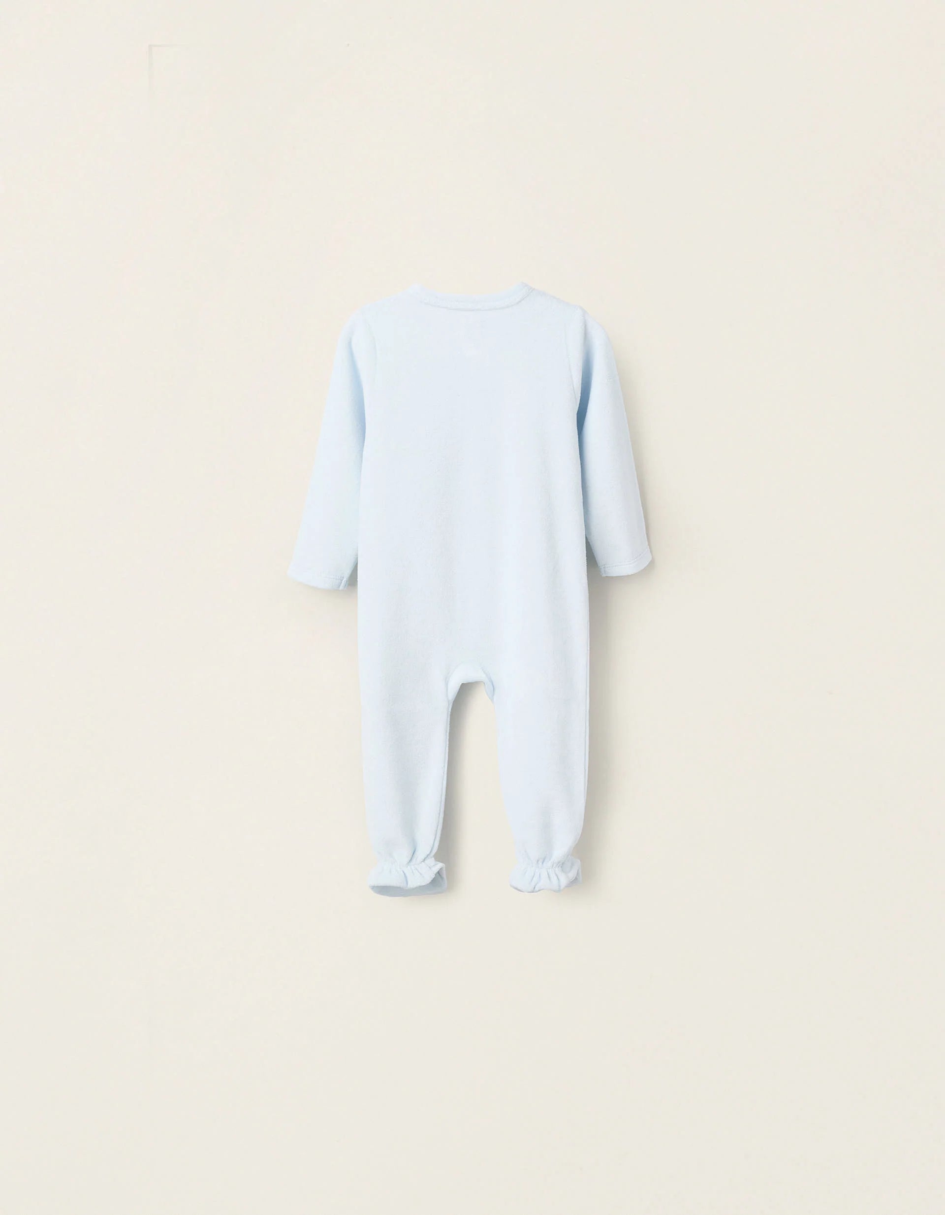 Light blue velour sleepsuit for baby boys, made from a soft and comfortable cotton blend. Front print. Printed inner label to avoid irritating the skin. Side snaps for easy dressing. Elasticated heels for a perfect fit. For a peaceful and snug sleep.