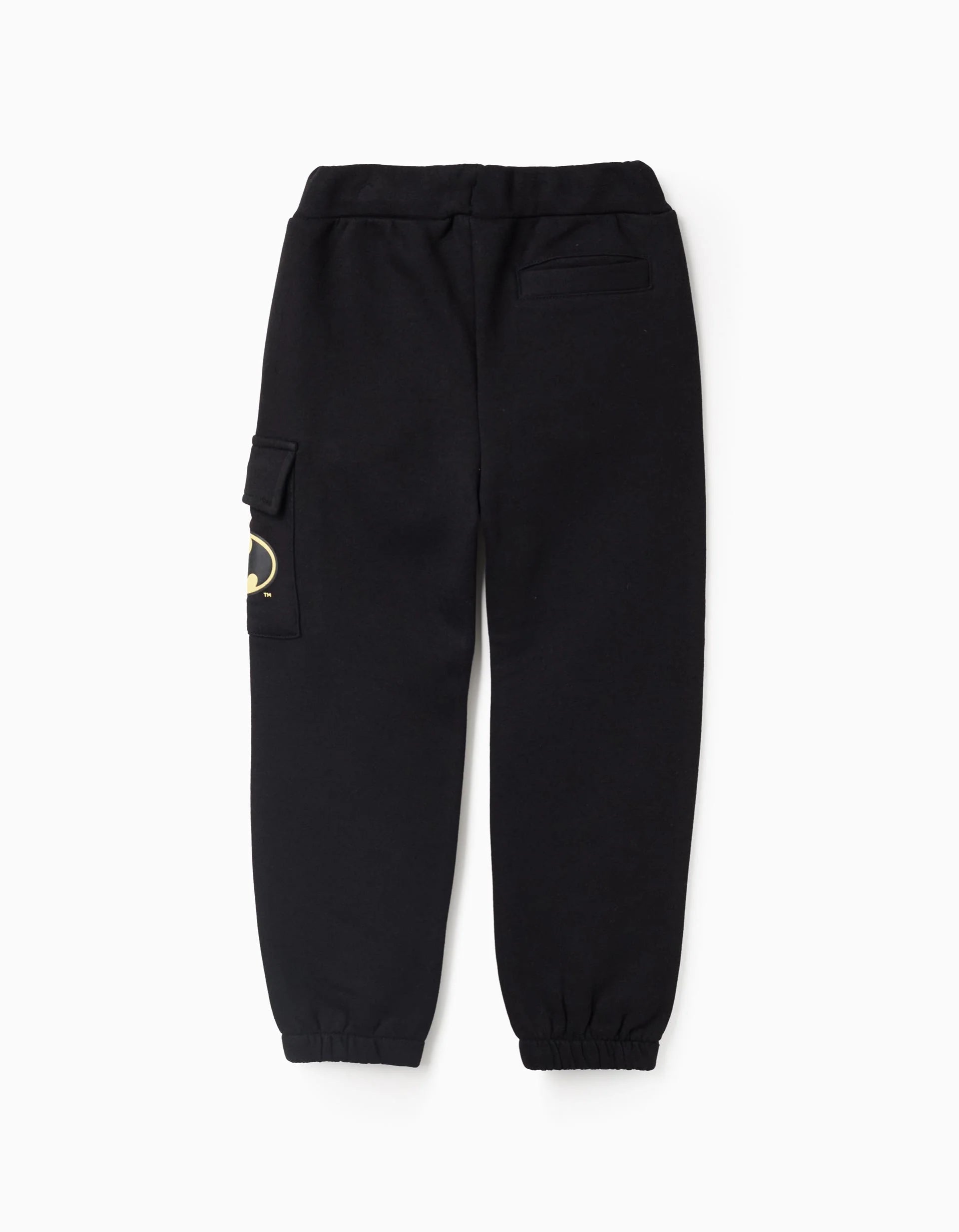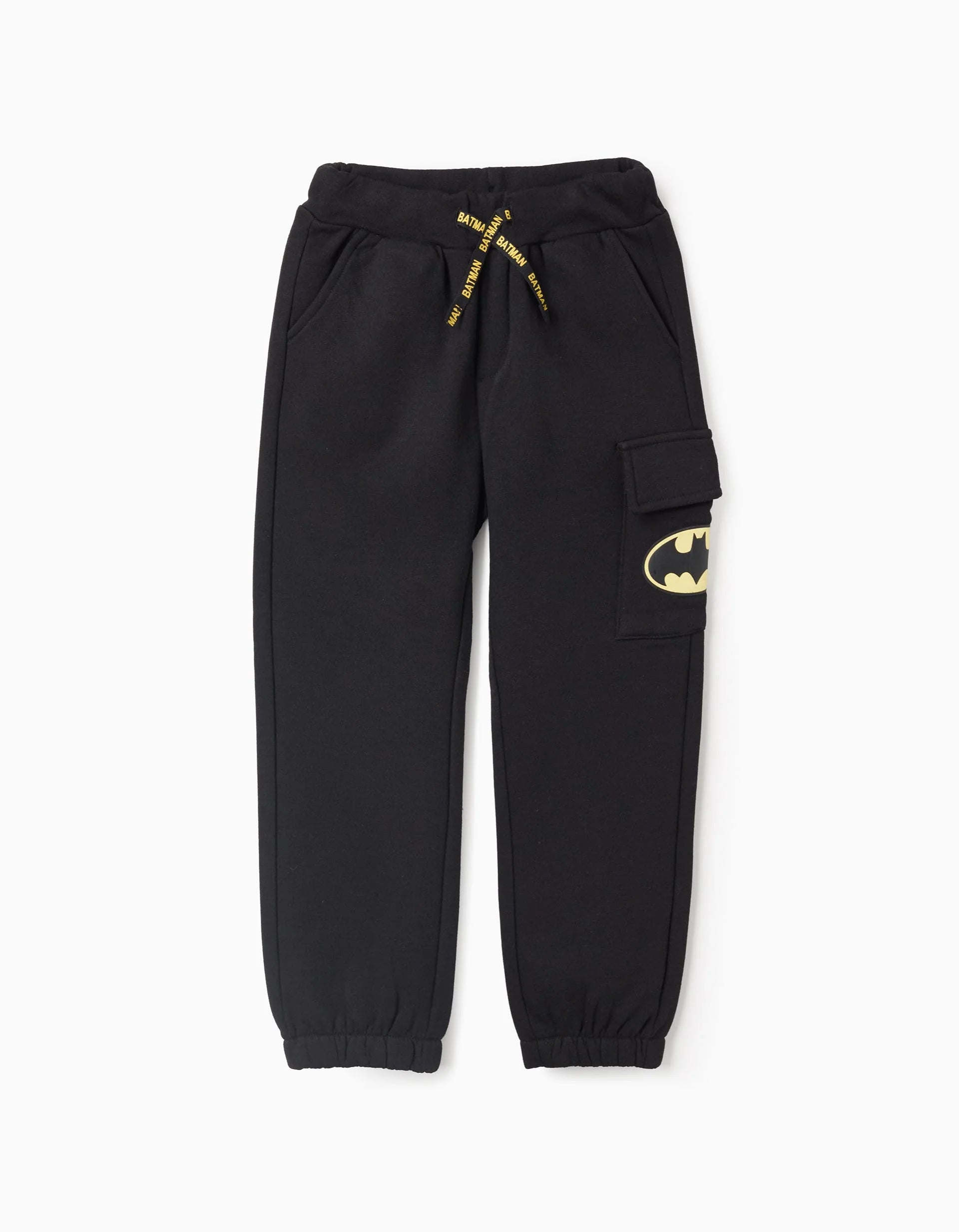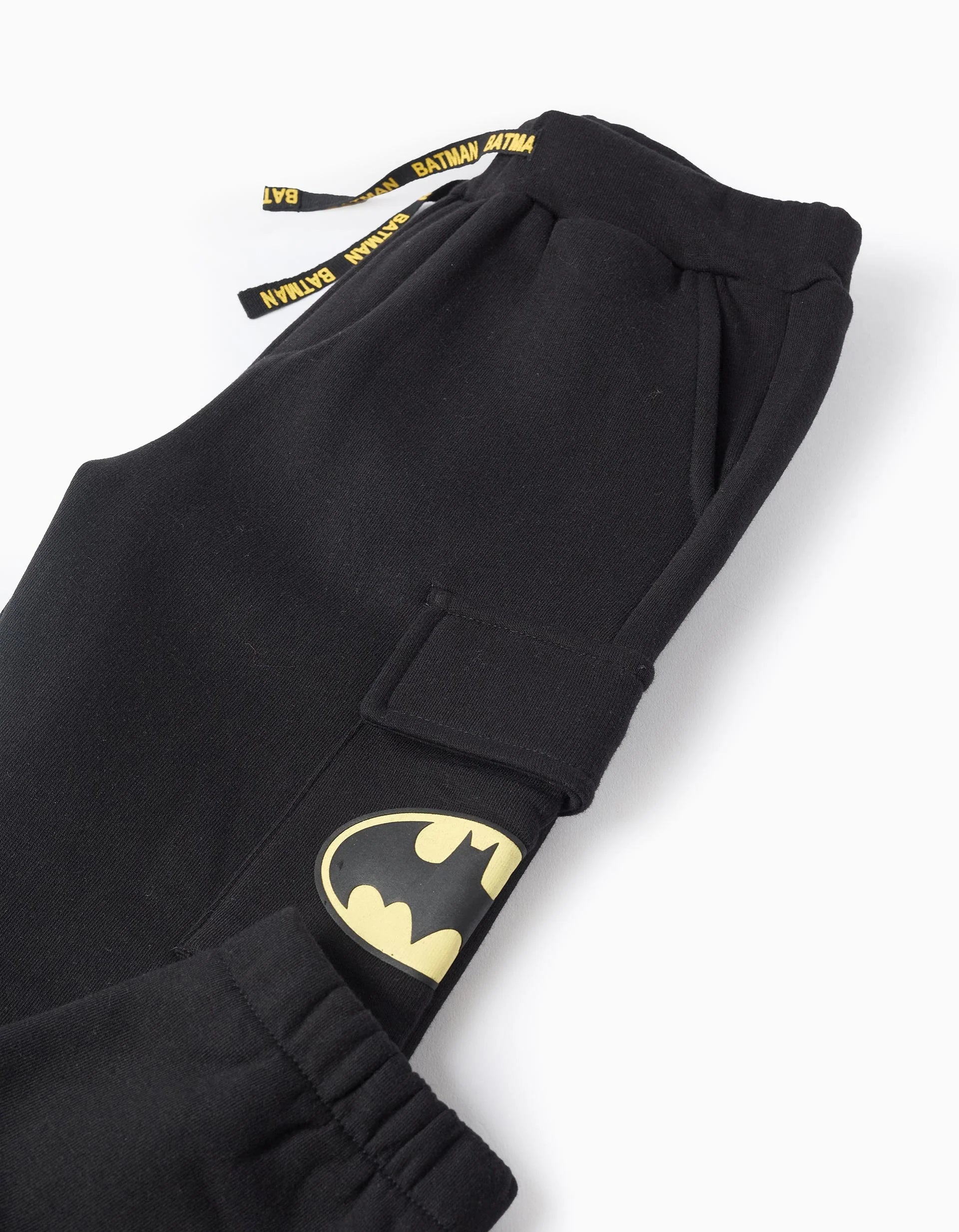 Black joggers in cotton fabric for boys, with Batman details. Includes two side pockets, a back pocket and a cargo pocket. Elasticated and comfortable waistband, adjustable on the inside and with a drawstring. Elasticated hems for a perfect fit.