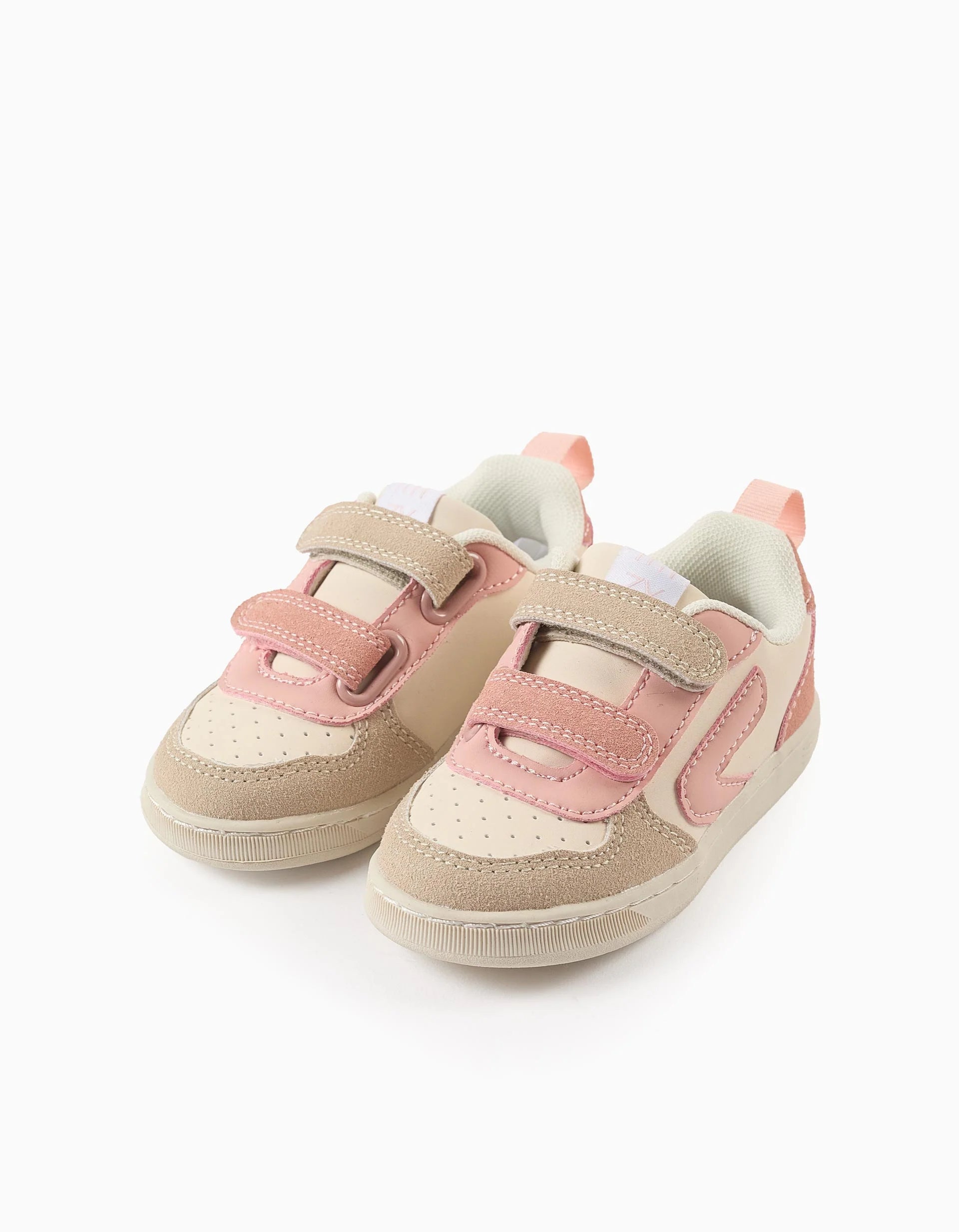 Beige and pink synthetic leather and mesh trainers for baby girls. With touch fasteners so they are easy to put on and take off. Mesh lining for greater comfort and breathability. Non-slip sole. A classic and timeless pair of trainers, suitable for any style, from the most traditional to the most modern. Big Me: Insoles with semicircle design so that the child can easily identify the corresponding foot, developing their independence.