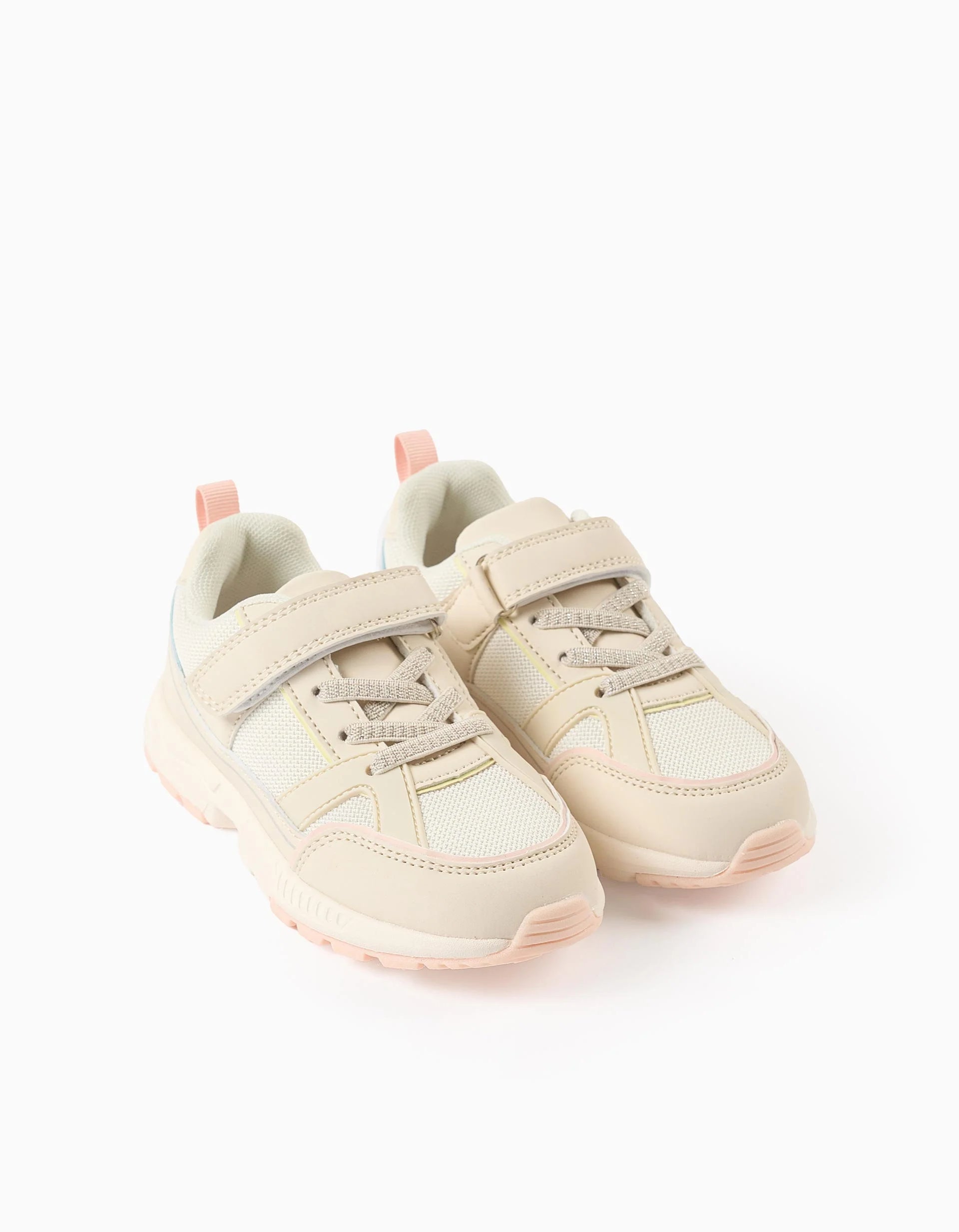 Beige trainers for girls, made from synthetic leather and mesh, with contrasting details in yellow, pink and blue. Elastic laces with silver lurex threads and touch fastener so they are easy to put on and adjust. Mesh lining for greater breathability. Chunky rubber sole, ultra-light and non-slip. A pair of original women's trainers! Big Me: Insoles with semicircle design so that your child can easily identify the corresponding foot, promoting their independence.