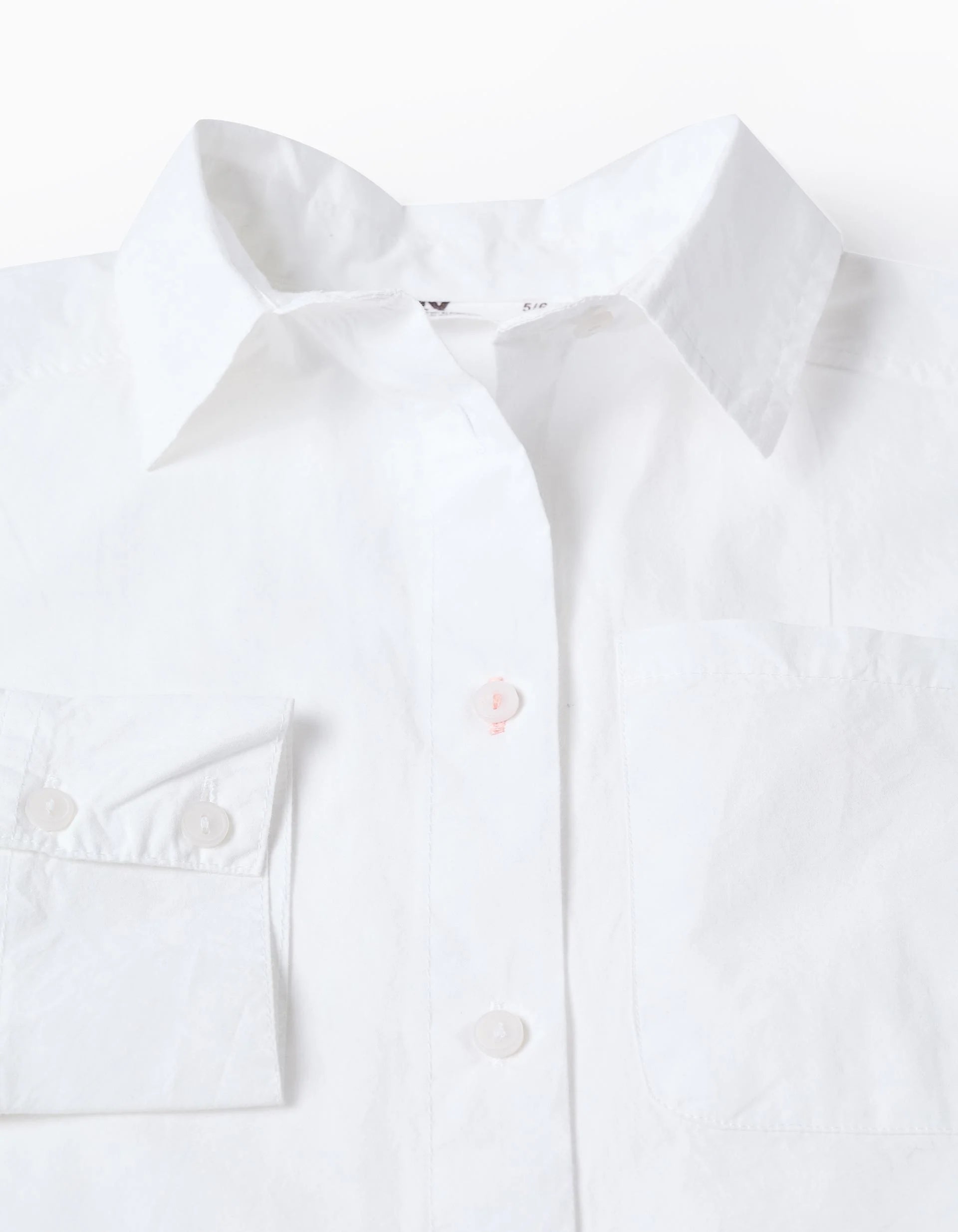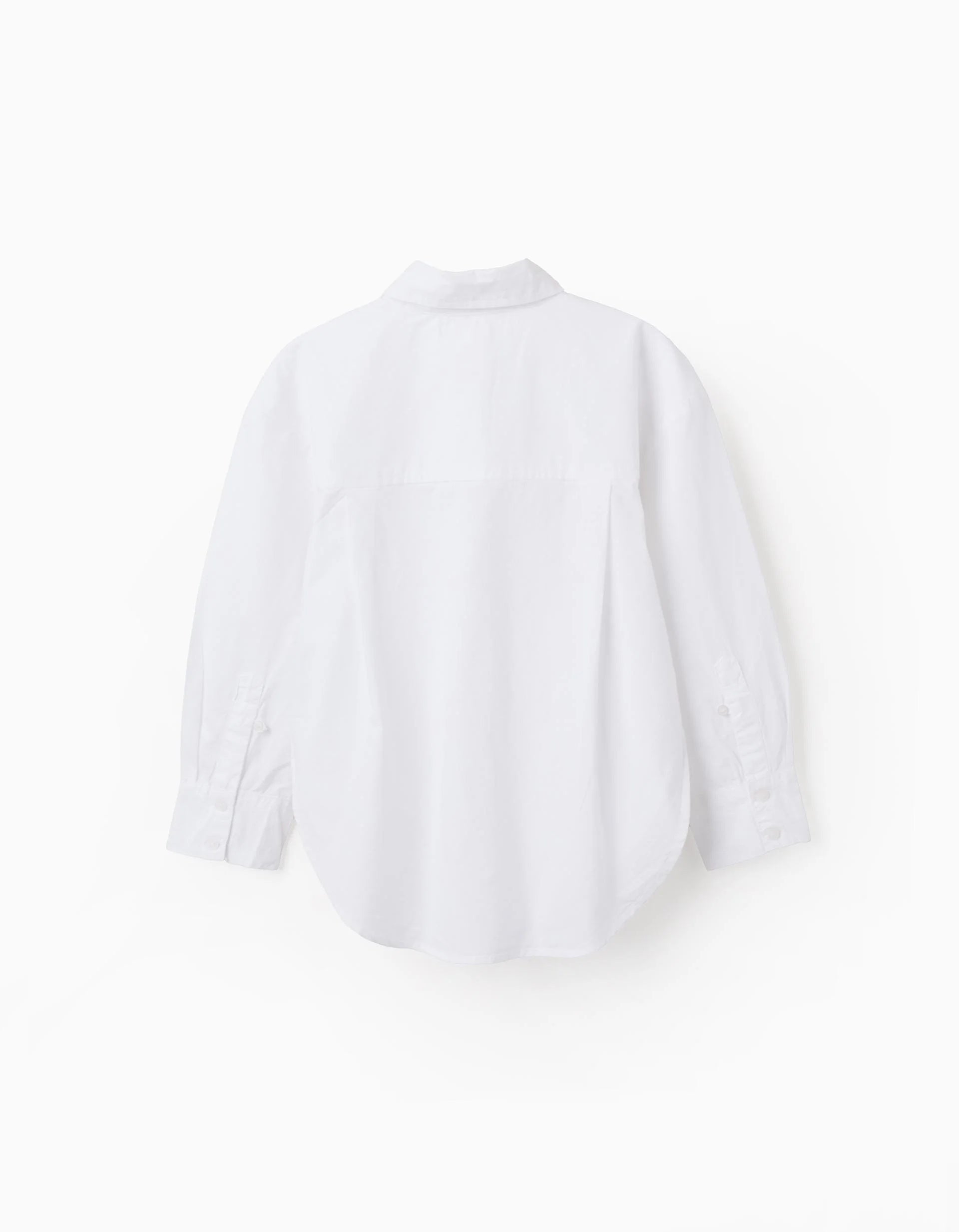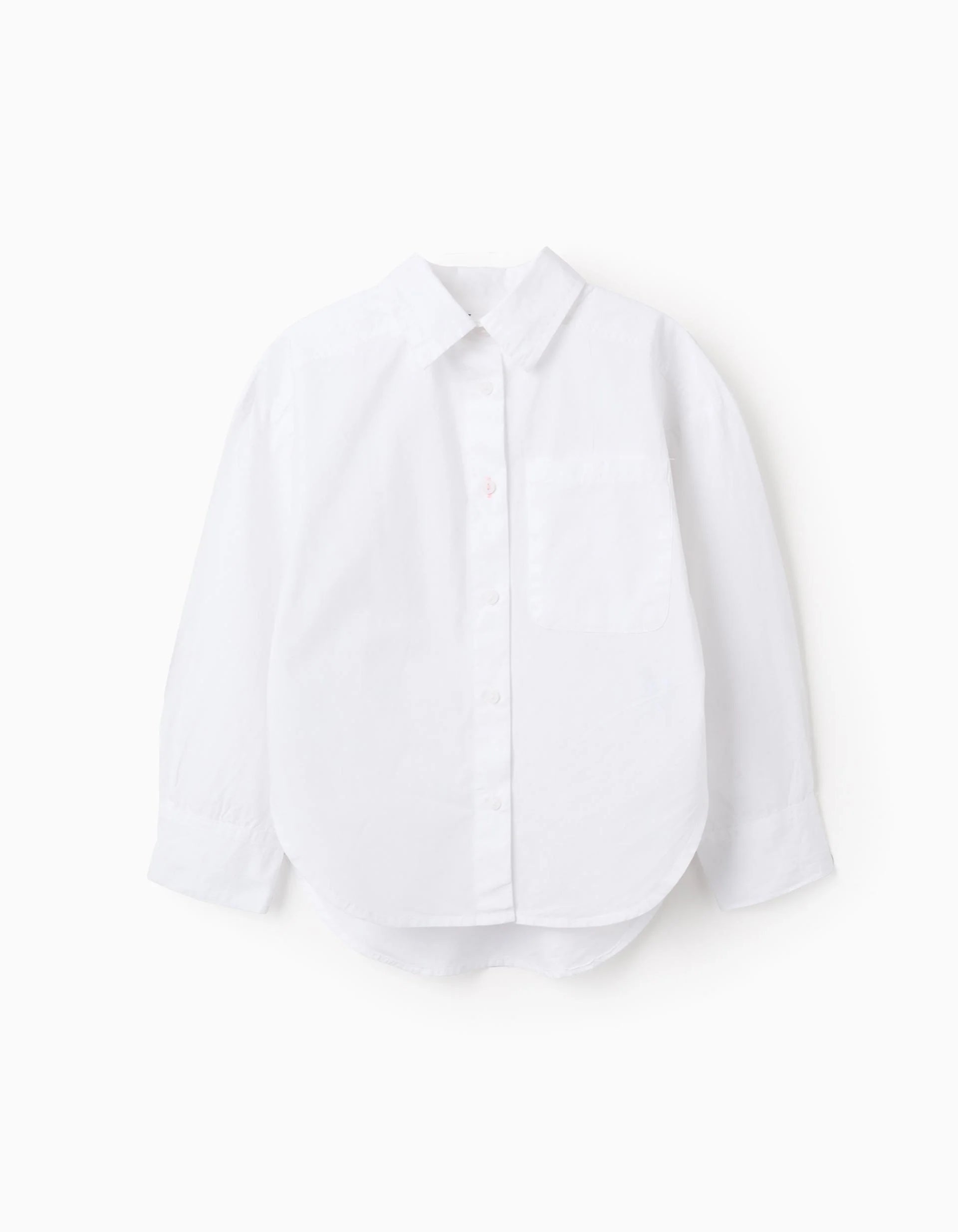 White poplin shirt made of 100% cotton for girls, with a classic yet modern style. Pocket on the chest. Rounded and asymmetrical hem, slightly longer at the back, with small slits on the sides. Loose fit and slightly oversized. Big Me: a button with contrasting thread and buttonhole so that the child can easily identify where to start buttoning, promoting their independence.