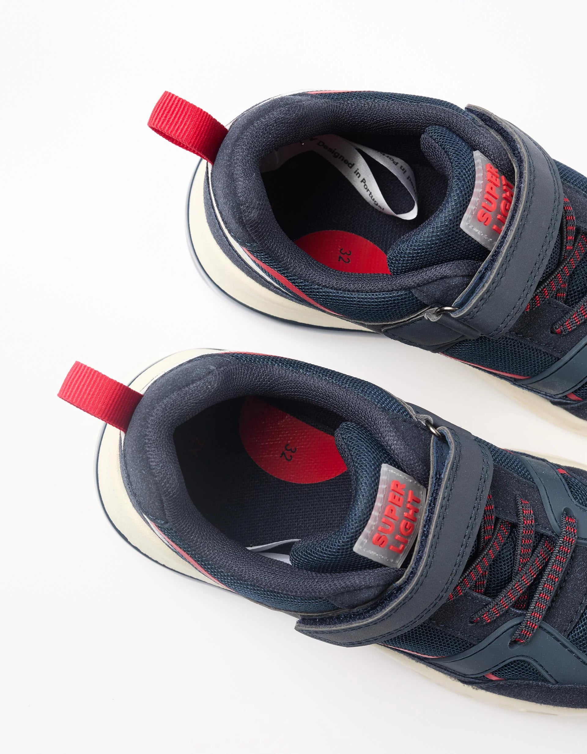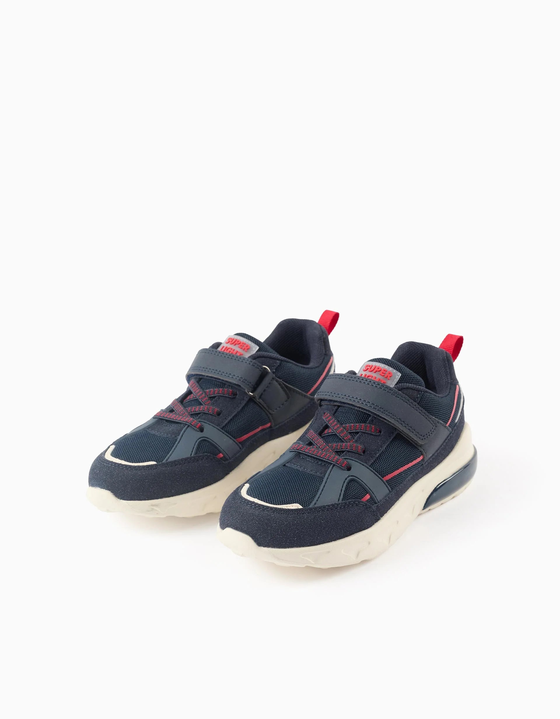 Light-up trainers for boys, made from synthetic leather and mesh in dark blue and red tones. Elastic laces and touch fastener so they are easy to put on and take off. Mesh lining for increased breathability. Ultra-light rubber sole with LED lights, activated by walking. A great success among kids!Big Me: Insoles with semicircle design to help your child easily identify the corresponding foot, promoting their independence.