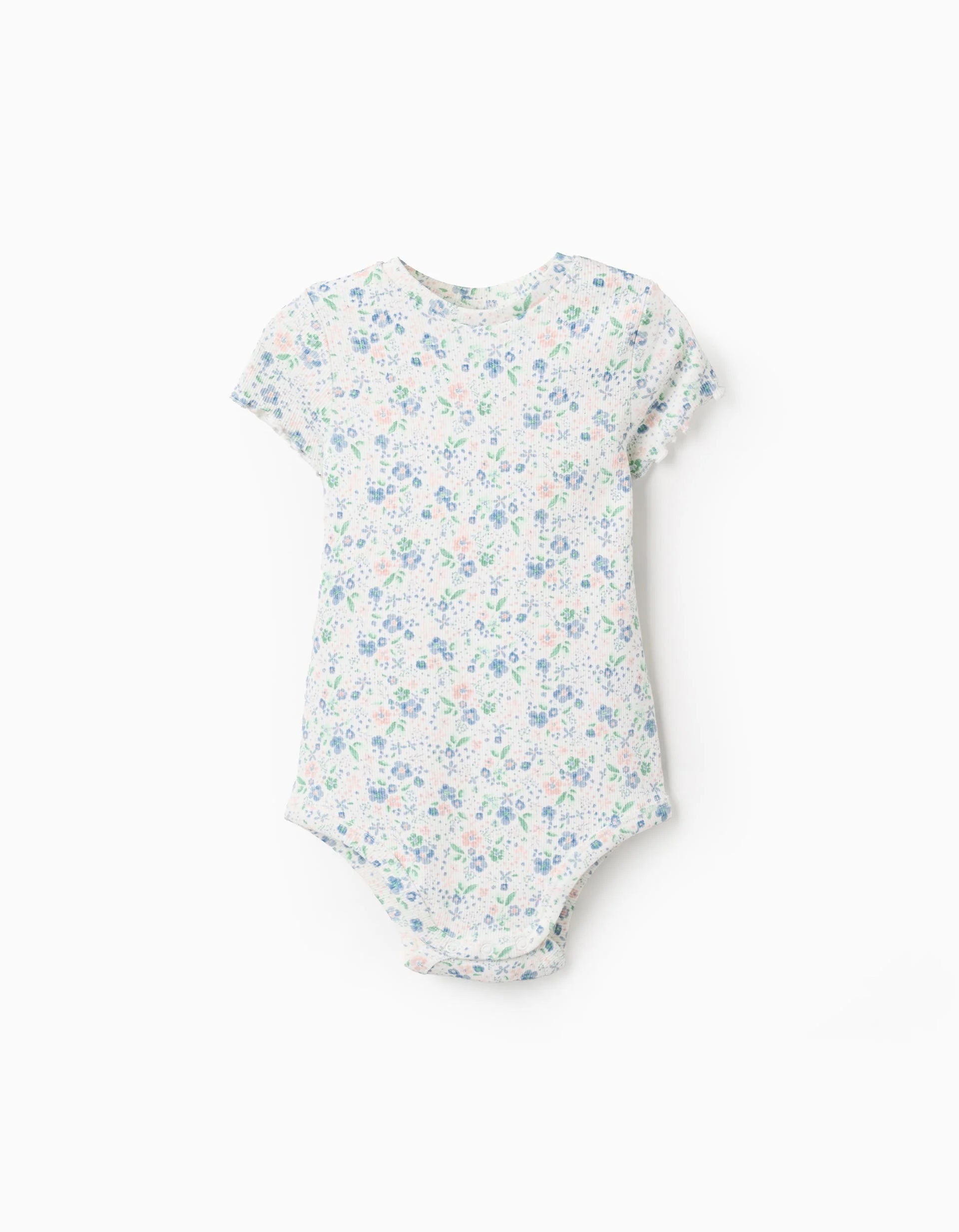 White ribbed bodysuit for baby girls, made of cotton with a touch of stretch for greater comfort and freedom of movement. Floral pattern in shades of pink, blue and aqua green. Sleeves with wavy edges. Printed inner label to avoid irritating the skin. An elegant and comfortable option to match the colours of spring! We Care: item with Oeko-Tex Standard 100 certification, which guarantees the absence of harmful or irritating substances for the skin.