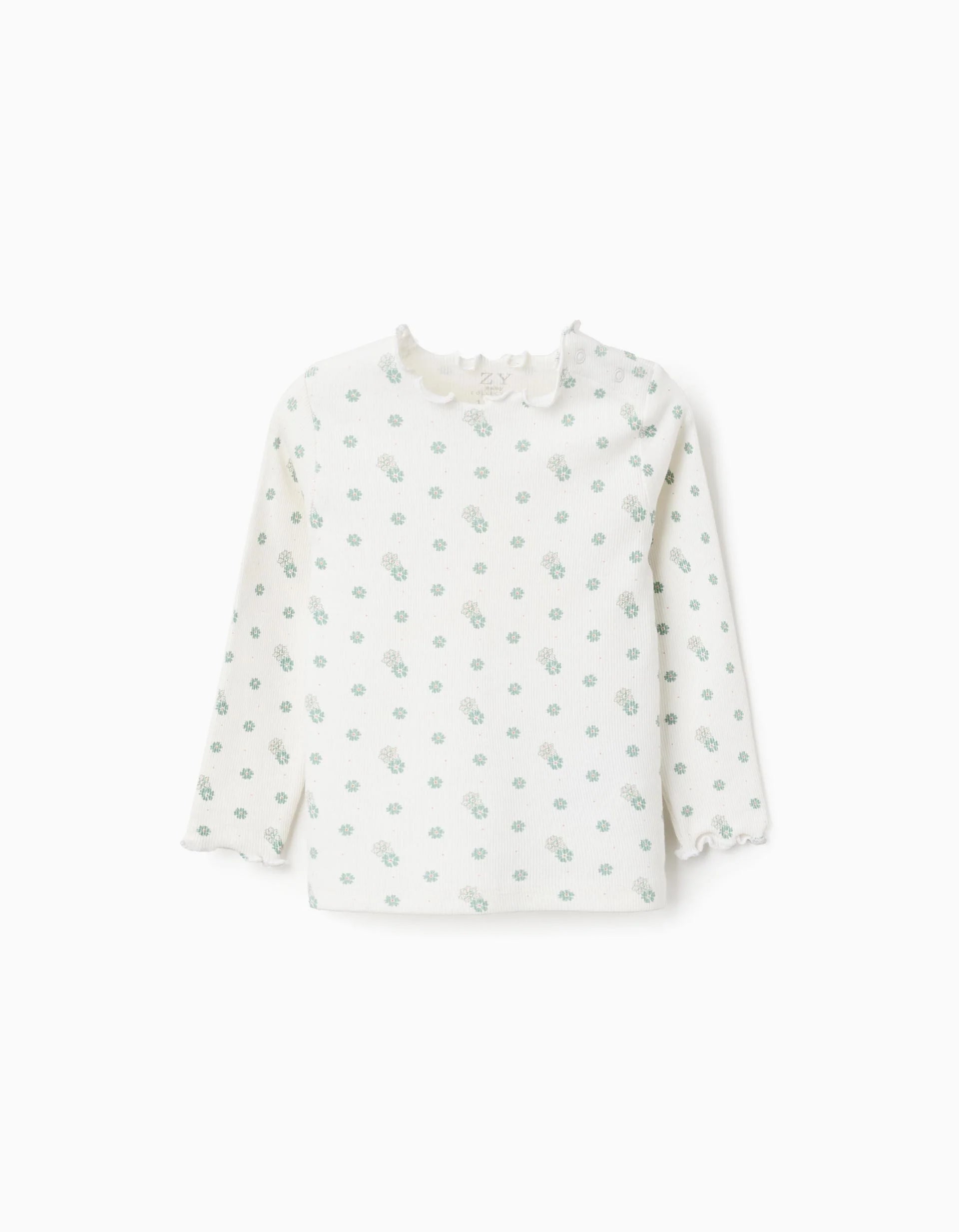 White long sleeve ribbed T-shirt for baby girls. Wavy edges. Green flower motif for a cheerful touch. Printed inner labels to avoid irritating the skin. For everyday looks! We Care: Oeko-Tex Standard 100 certified item, ensuring the absence of harmful or irritating substances for the skin.