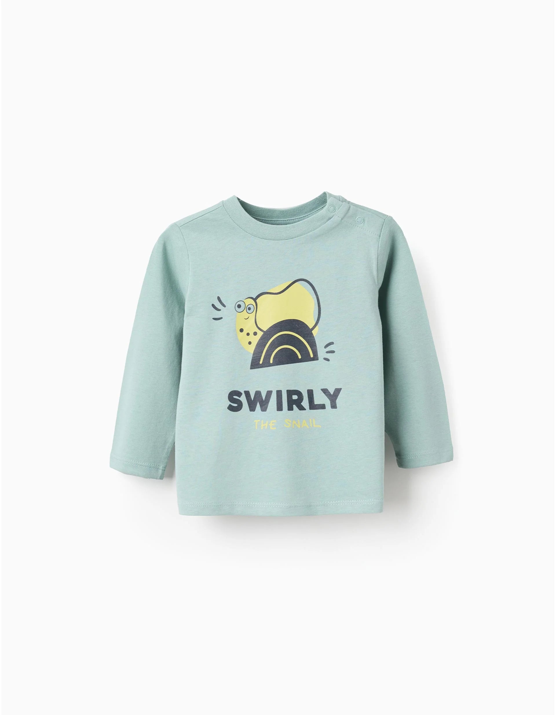 Aqua-green long-sleeved T-shirt for baby boys, 100 per cent cotton. Snail print on the front. Press studs on the shoulder for easy dressing. Printed inner label so as not to irritate the skin. A fun print for everyday outfits! We Care: item certified Oeko-Tex Standard 100, which guarantees the absence of harmful or irritating substances for the skin.