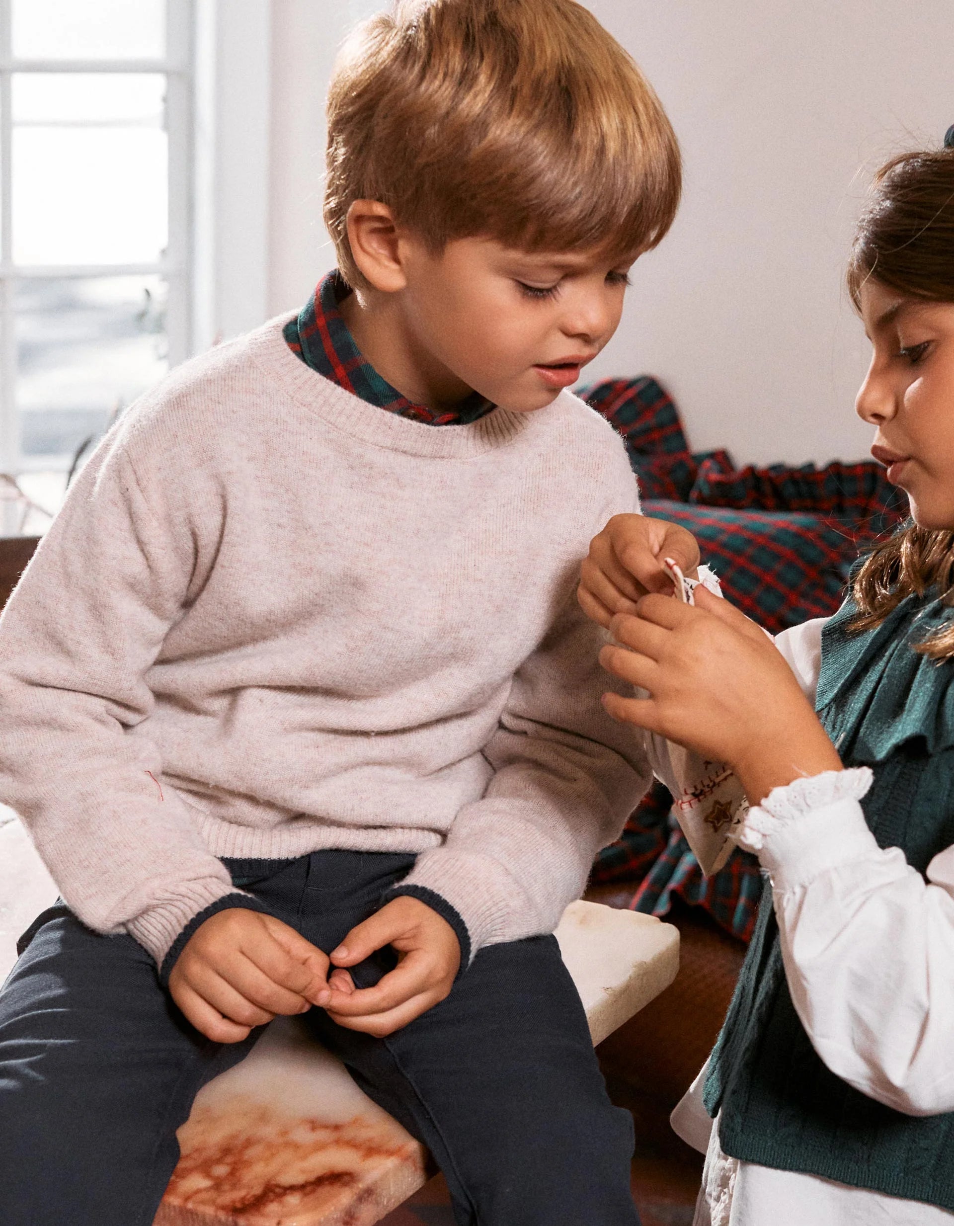 This light beige knitted jumper is the perfect choice to keep your boy comfortable during the cooler days. Made from a soft fabric, it provides a pleasant feel to the touch, allowing your child to move freely. Its classic design, with long sleeves and ribbed ends, makes it ideal for any occasion, from a park outing to a family gathering. Perfect for the Autumn and Winter seasons, this jumper is an essential item in every boy's wardrobe.