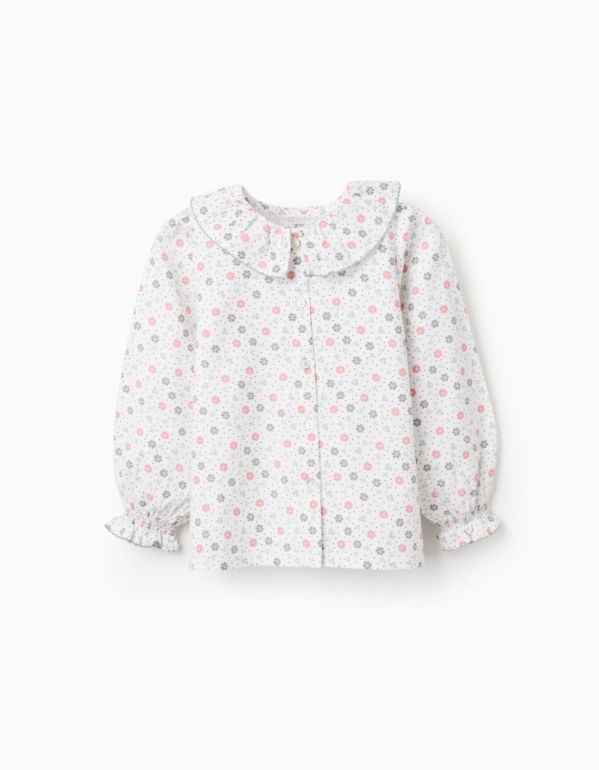 White 100% cotton shirt for girls, with a floral pattern in shades of pink and green. Ruffled collar. Elasticated and wavy cuffs. A-line fit. An elegant piece with a touch of tradition!