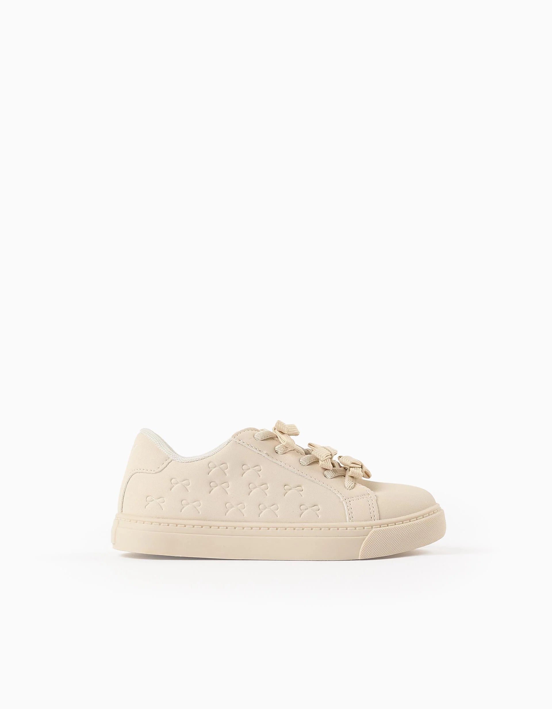 Beige trainers for girls, made of synthetic leather, with a motif of bows in relief. Fastens with elastic laces decorated with decorative bows for easy wearing. Mesh interior for greater breathability. Non-slip rubber sole. Big Me: insoles with semicircle design so that the child can easily identify the corresponding foot, developing their independence.