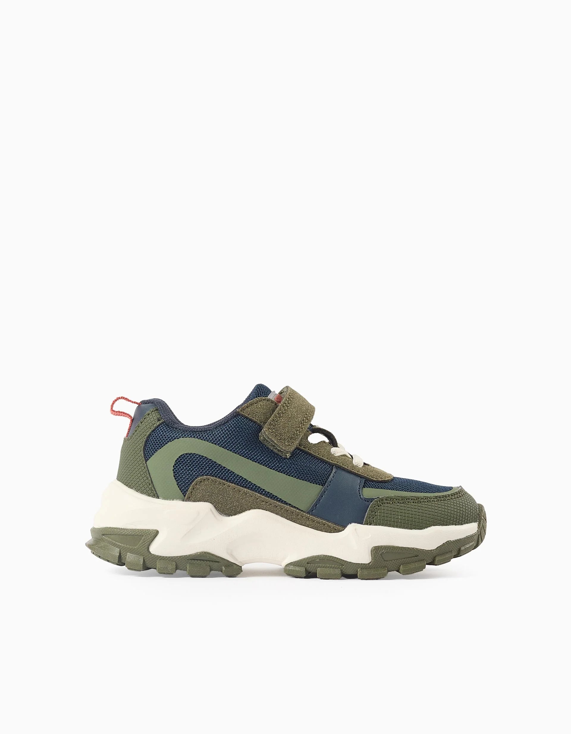 Synthetic leather and mesh trainers for boys in shades of dark green, dark blue and white. Easy to fasten with a hook-and-loop fastener and elastic laces for a perfect fit. High, ultra-light sole with anti-slip effect. A comfortable pair of trainers, ideal for sporty and casual looks! Big Me: Insoles with a semi-circular design so that your child can easily identify the corresponding foot, promoting their autonomy.