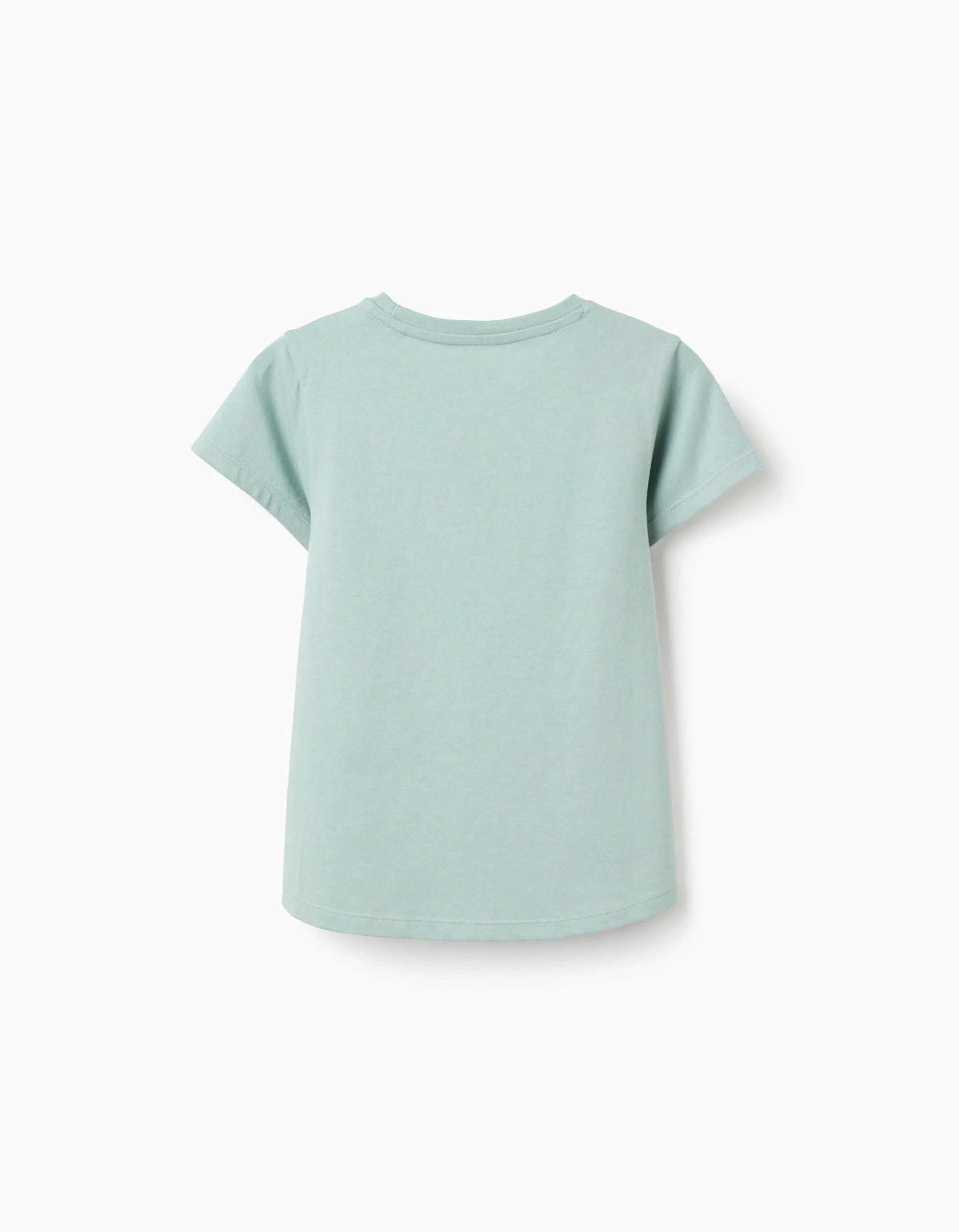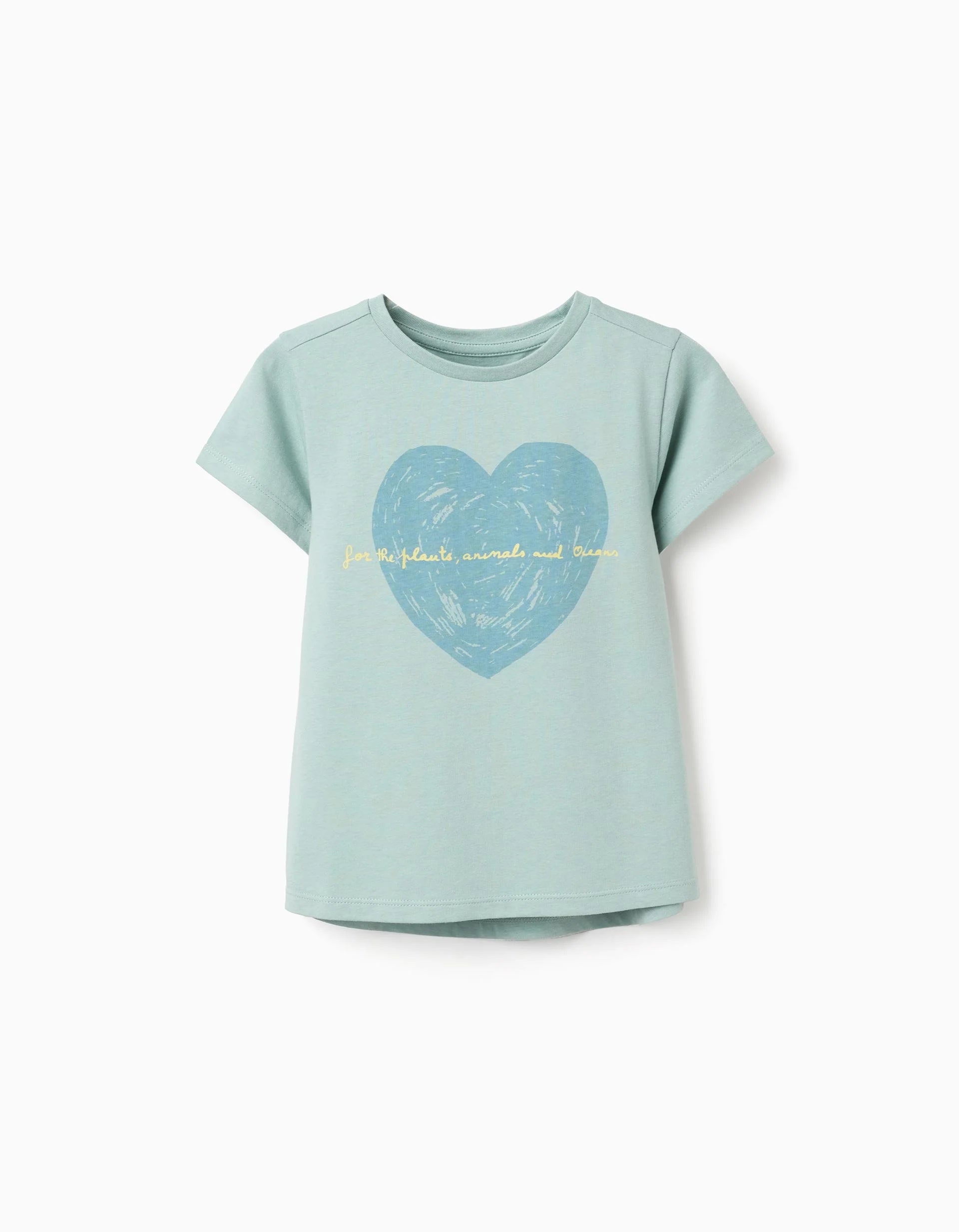 Light green T-shirt for girls, 100% cotton. Front print of a heart. Ribbed collar. Printed inner label not to irritate the skin. A comfortable and cheerful T-shirt! We Care: Oeko-Tex Standard 100 certified item, which guarantees the absence of substances that are harmful or irritating to the skin.