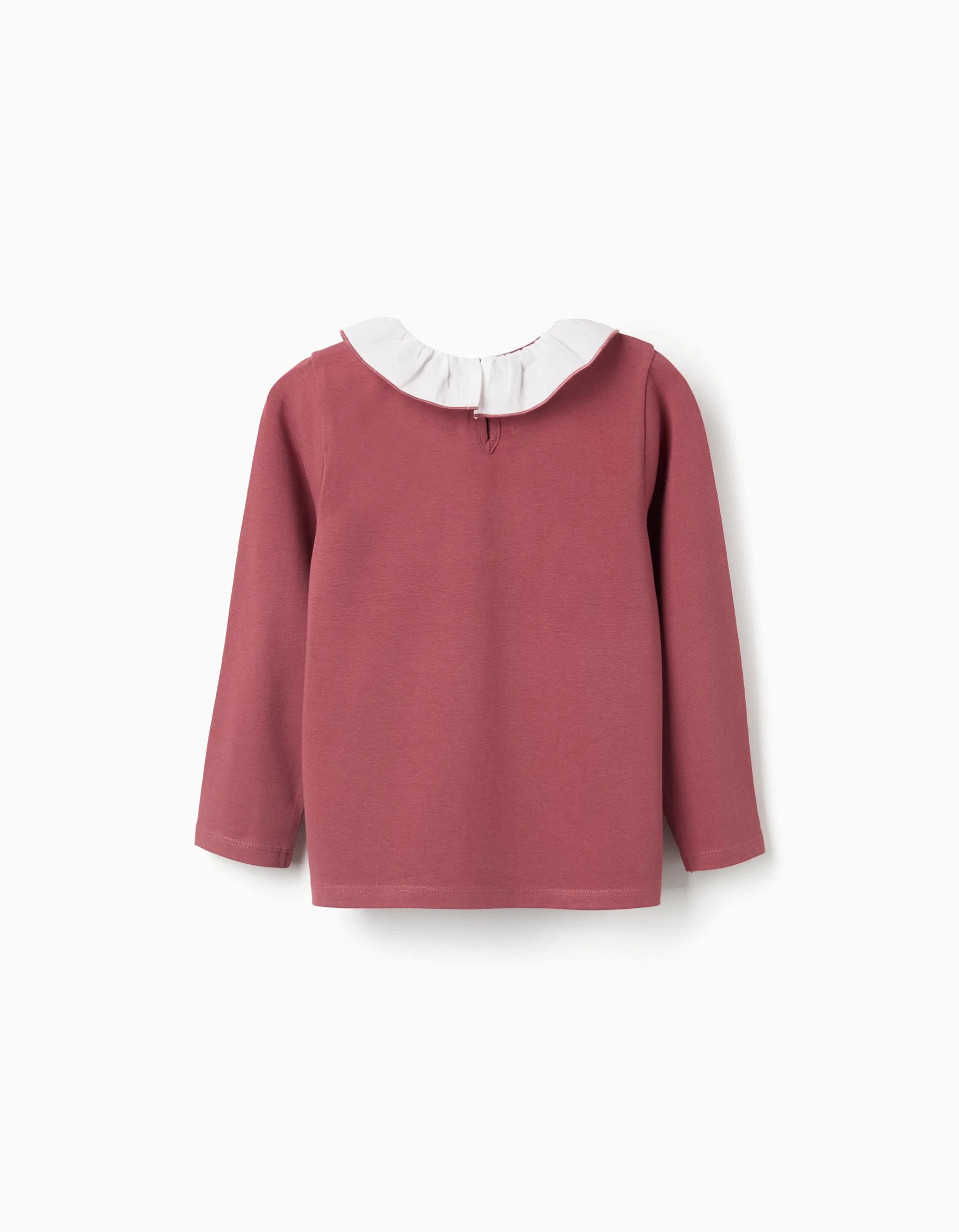 Long Sleeve T-shirt with Print and Ruffled Collar for Girls, Dark Pink