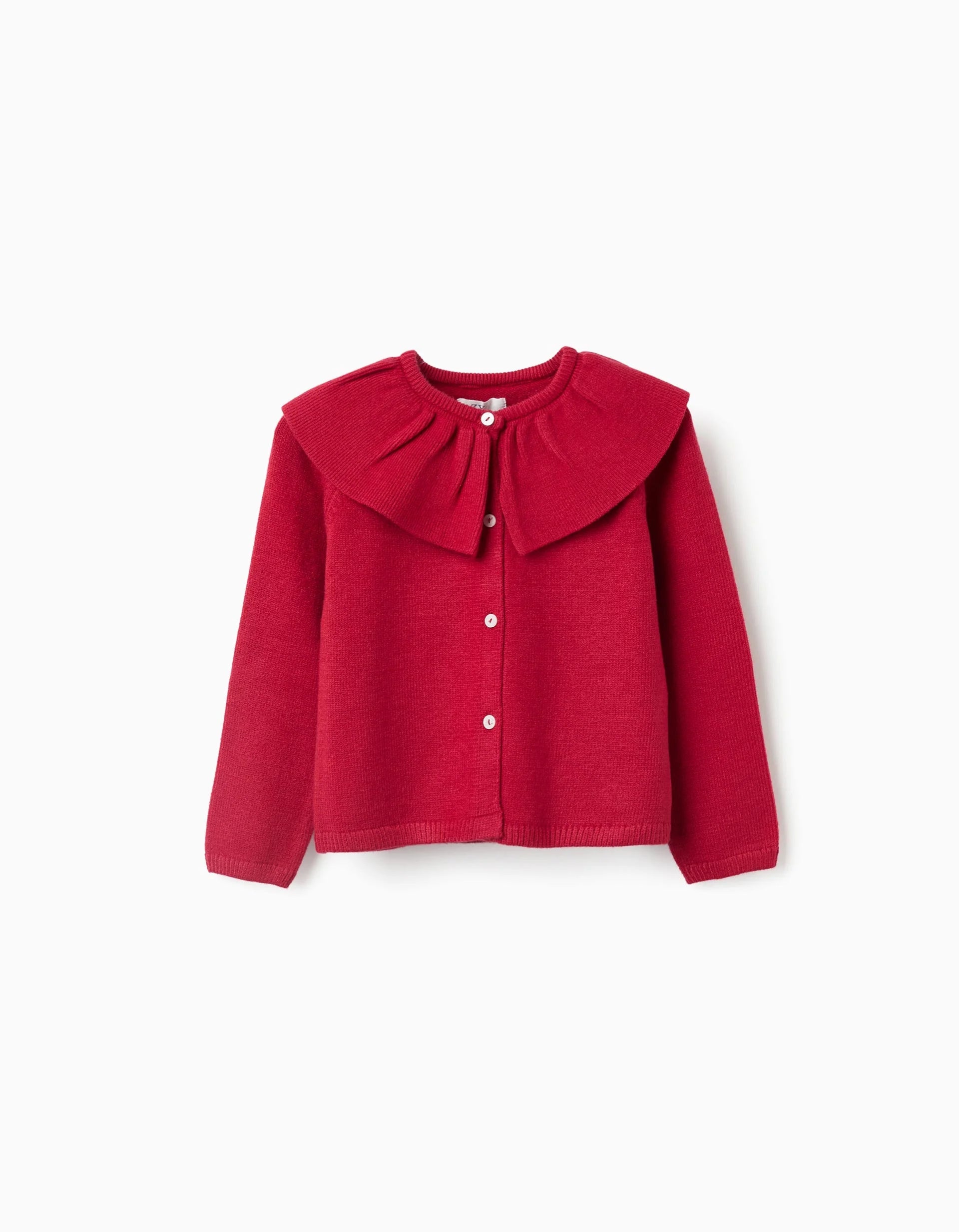 Knit Cardigan with Ruffled Maxi Collar for Girls, Red