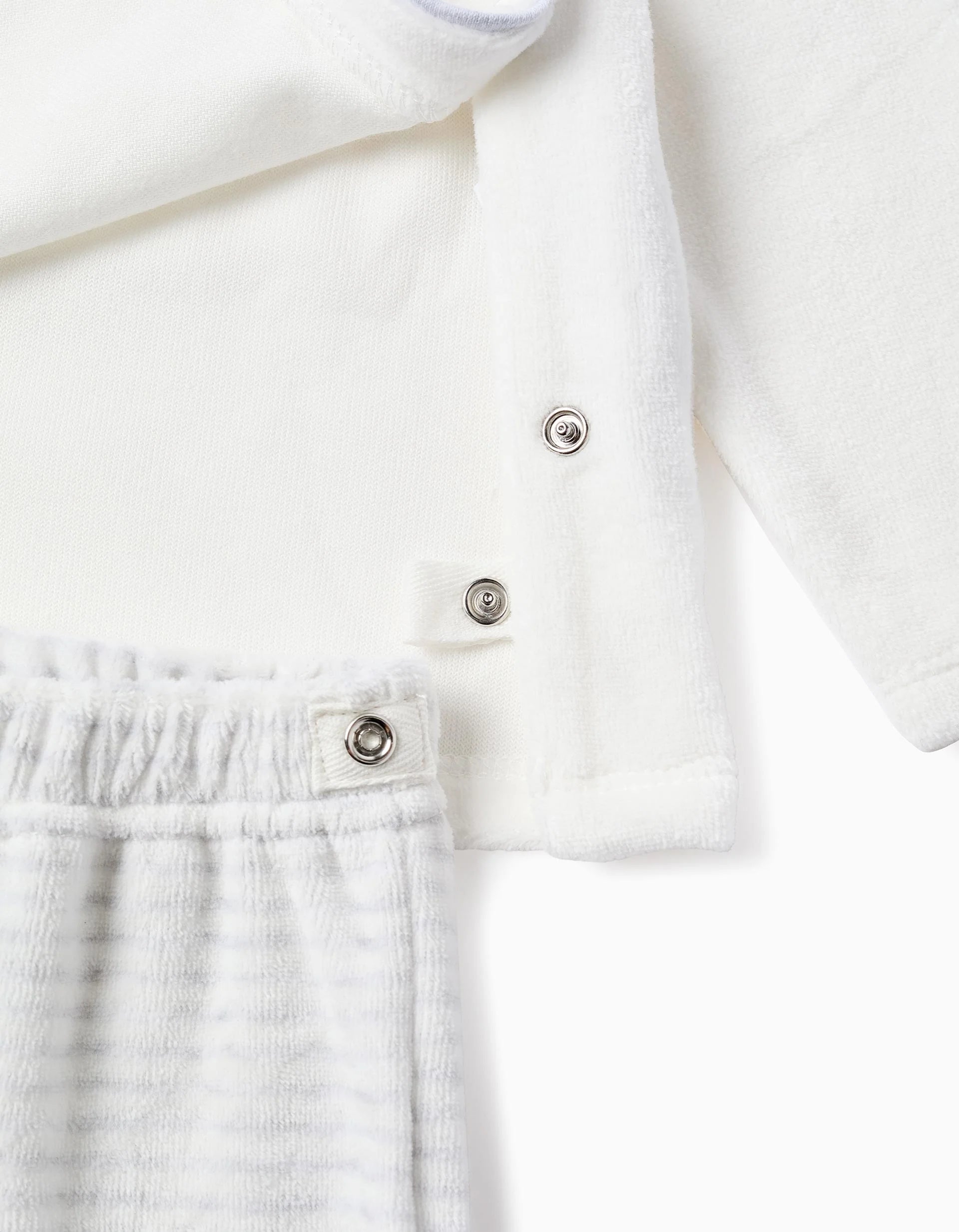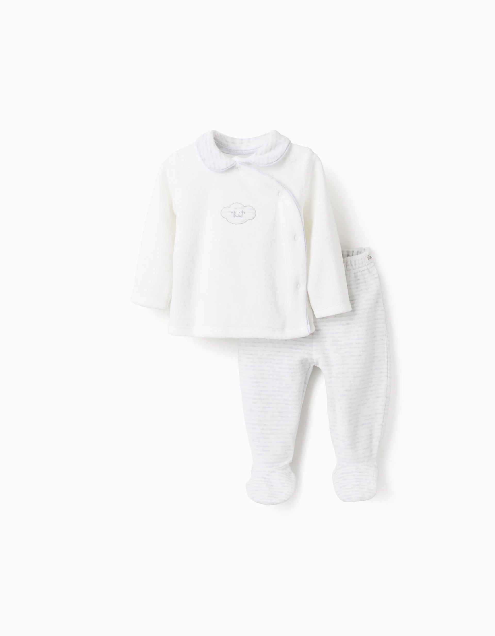 Two-piece velour set for newborns. It consists of a white sweatshirt with a Peter Pan collar, an embroidered cloud on the front and side snaps for easy dressing. It also includes a pair of grey trousers with an elasticated waist and heel for a perfect fit. The two garments become one thanks to a snap-on appliqué at the base of the sweatshirt and on the waistband of the trousers, which ensures that the garments stay together and prevent colds. Printed interior labels so as not to irritate the skin. Practical and warm pyjamas, perfect for cold nights!
